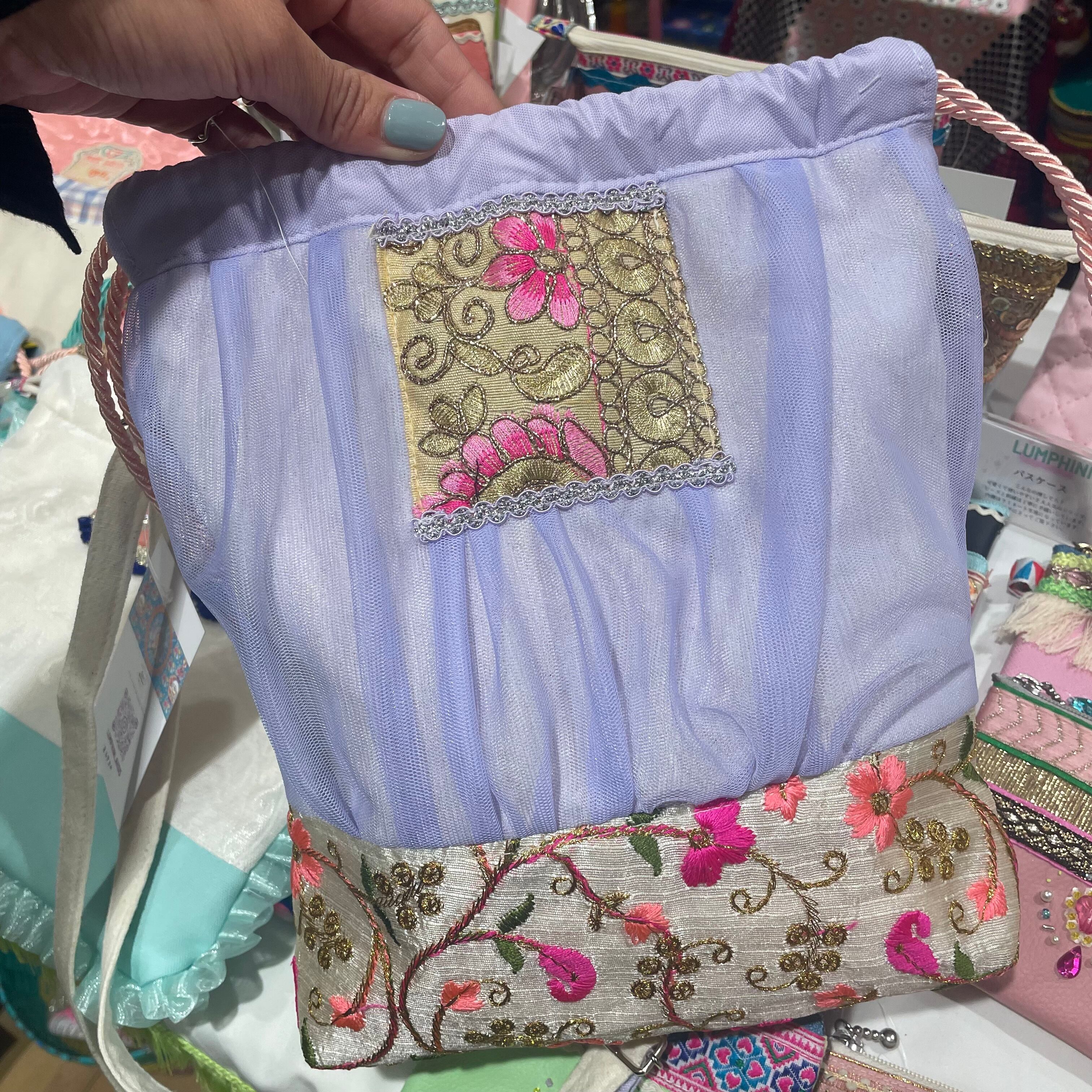カラフルだけど品のあるインド刺繍生地にかわいいラベンダーのチュール生地をアイボリーコットンに組み合わせて制作した巾着です。