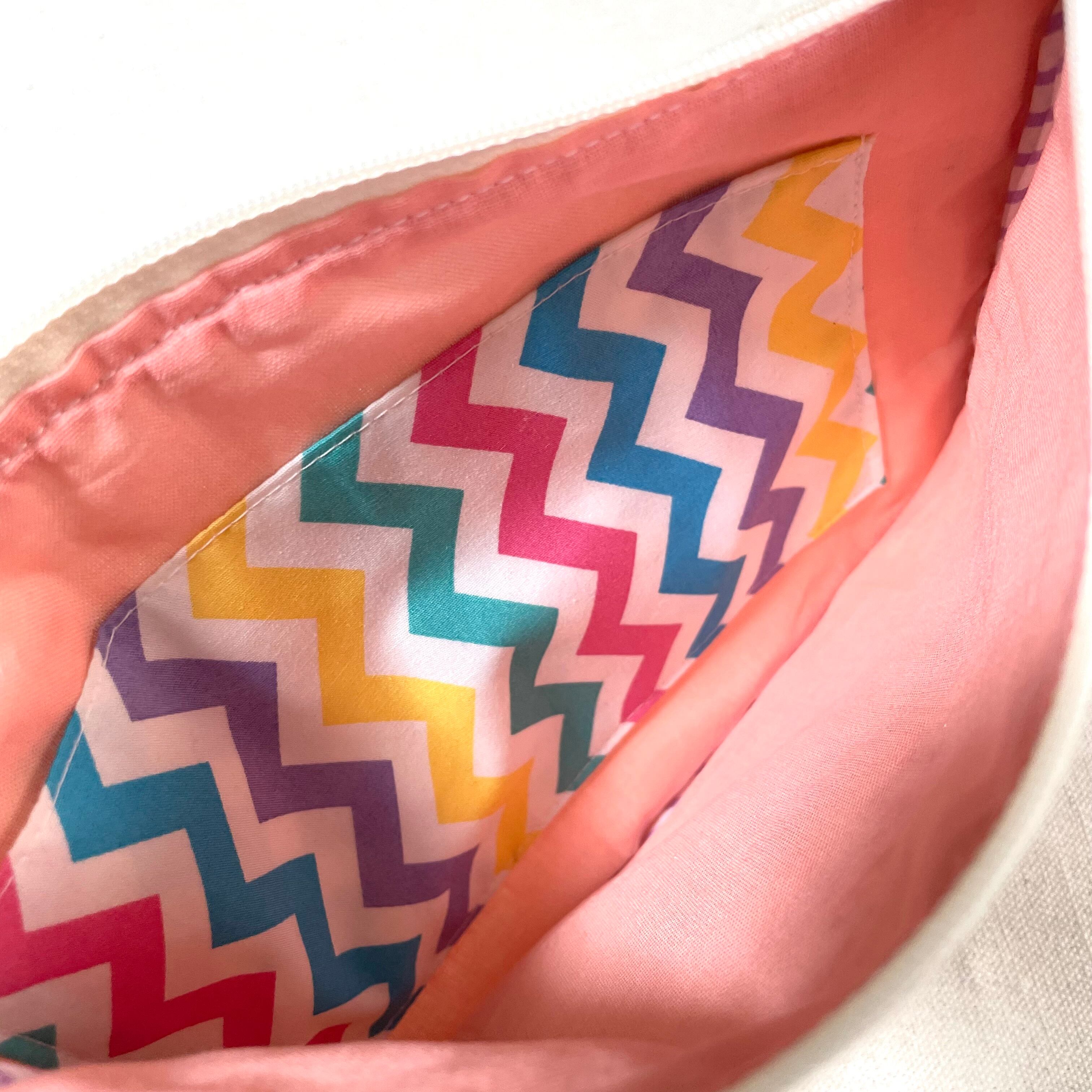 後ろ側も同じアイボリー生地にネオンイエローのテープがついてかわいいです。