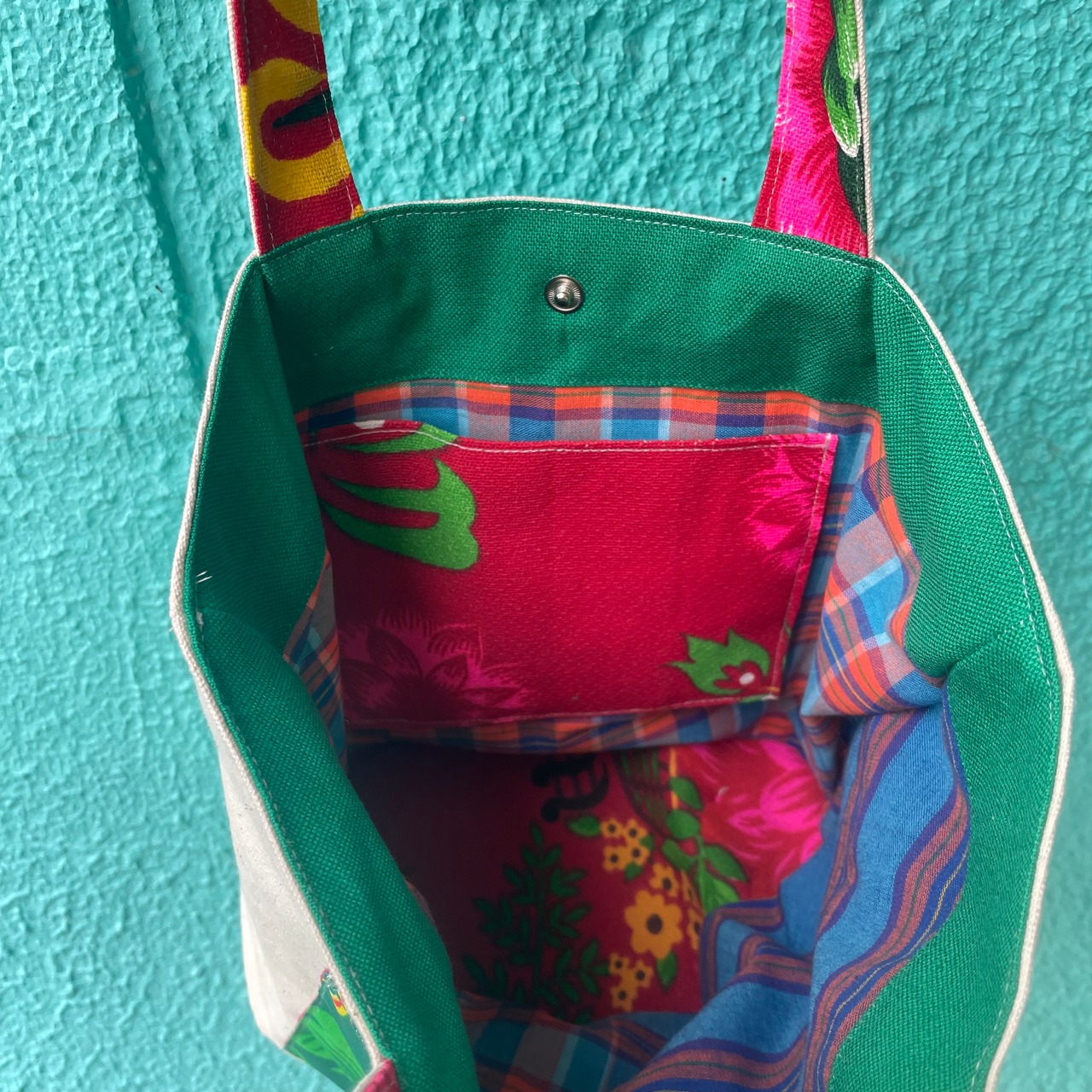 内側は表底部分と同じグリーン生地とブルーベースのパーカオマーにタイの花柄生地でポケット1つ付きです。カラフルでとても可愛い内側に仕上がっておりますので開けても楽しいデザインです。