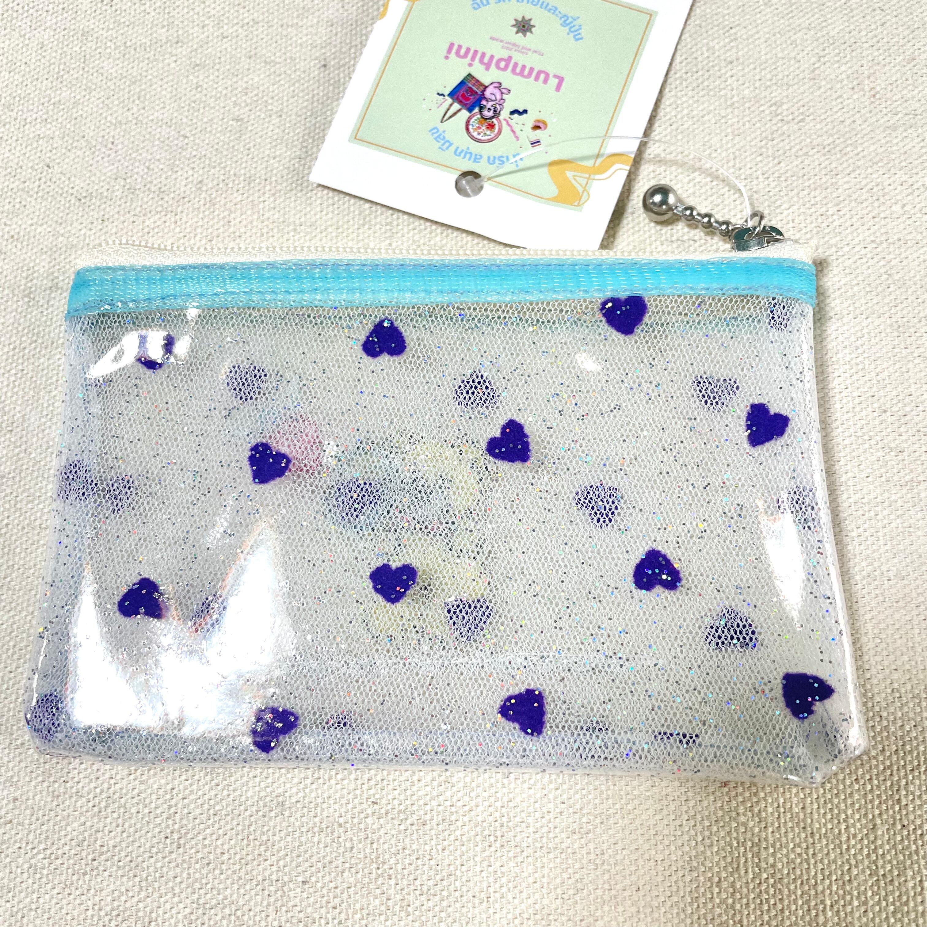 パープルのハートが入ったチュール素材にホログラムラメPVCを組み合わせたキラキラのミニポーチです。