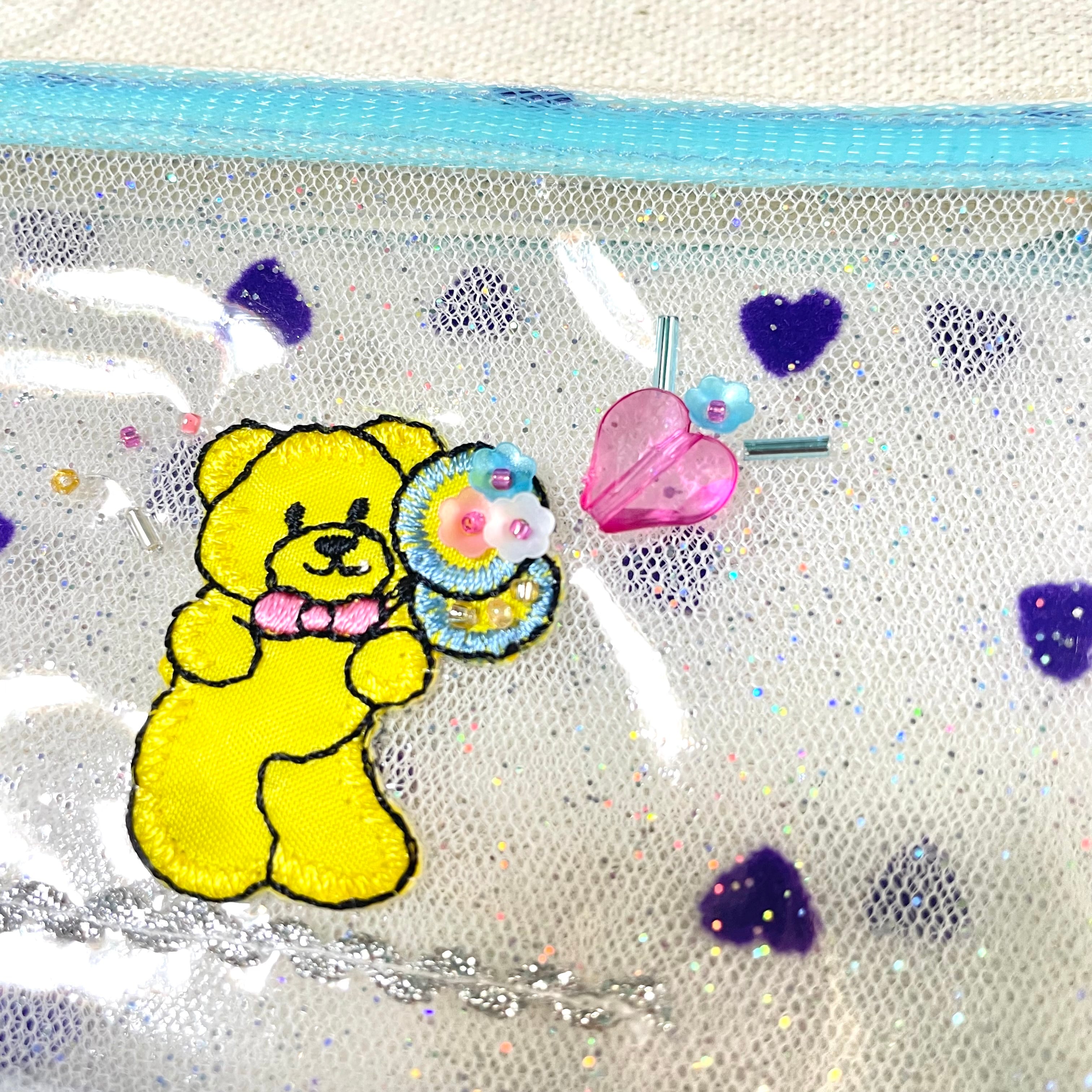 まんなかにはクマさんワッペンにハートビーズや細かいビーズなどを散りばめたデザインです。