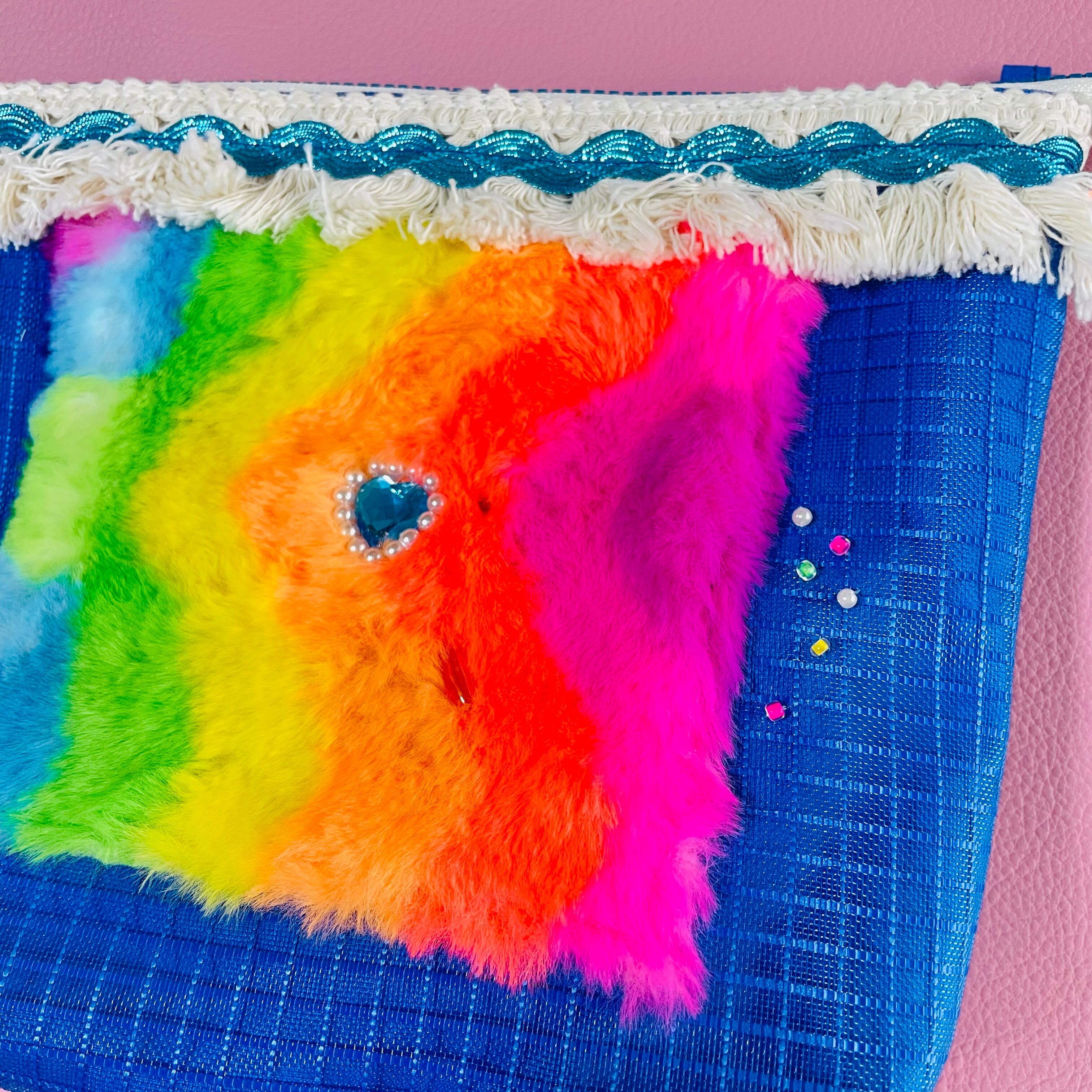 カラフルなレインボーファーにハートのビジューやビーズがついたマチ付きポーチです。