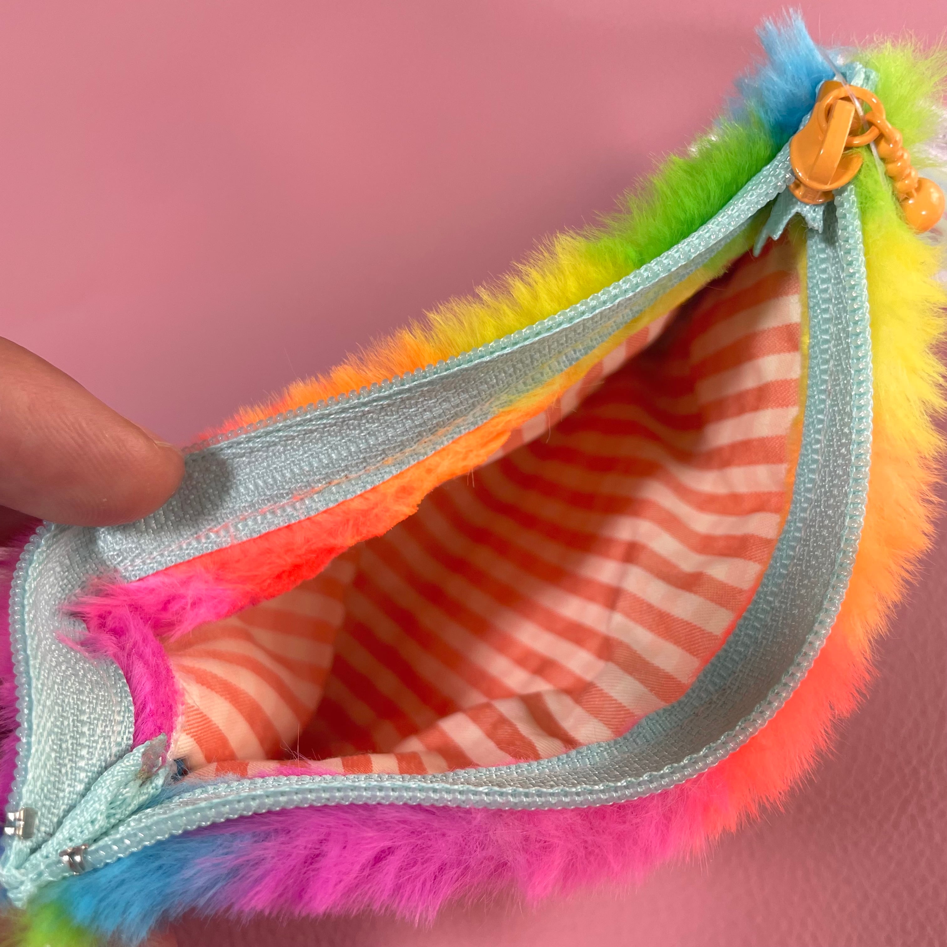 カラフルなレインボーファーはとても手触りのよいフェイクファーを使用しておりますので、ふわふわで触ると幸せな気分になります。