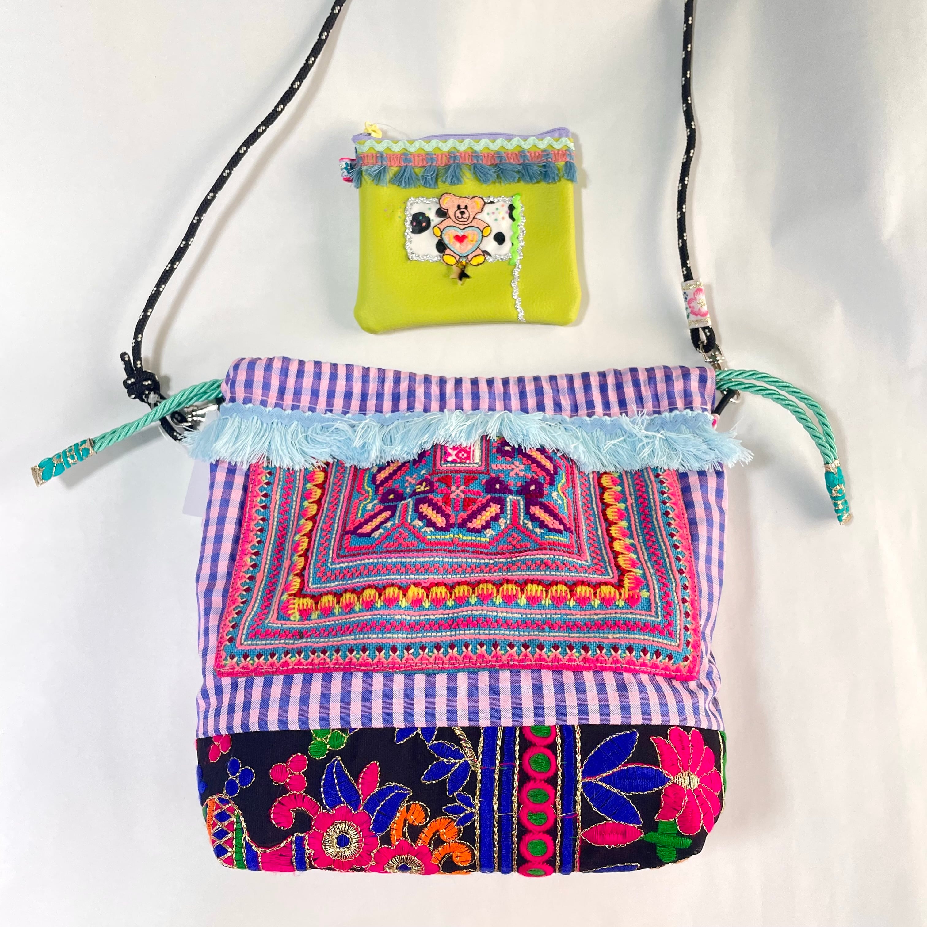 ギンガムチェックとモン族手刺繍のmini巾着Bag