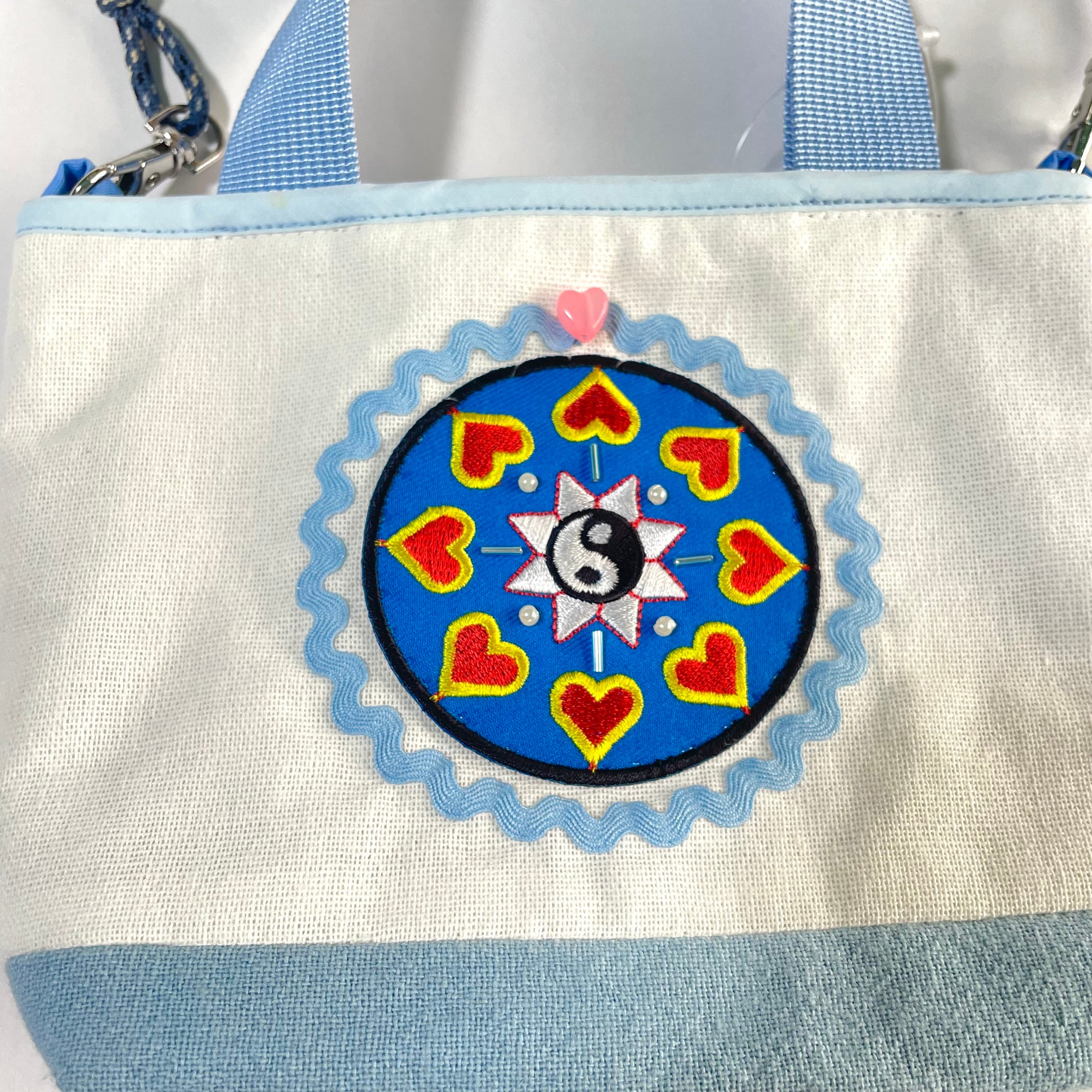チェンマイのコットン生地にワッペンとなみなみテープ、ハートビーズが付いています。