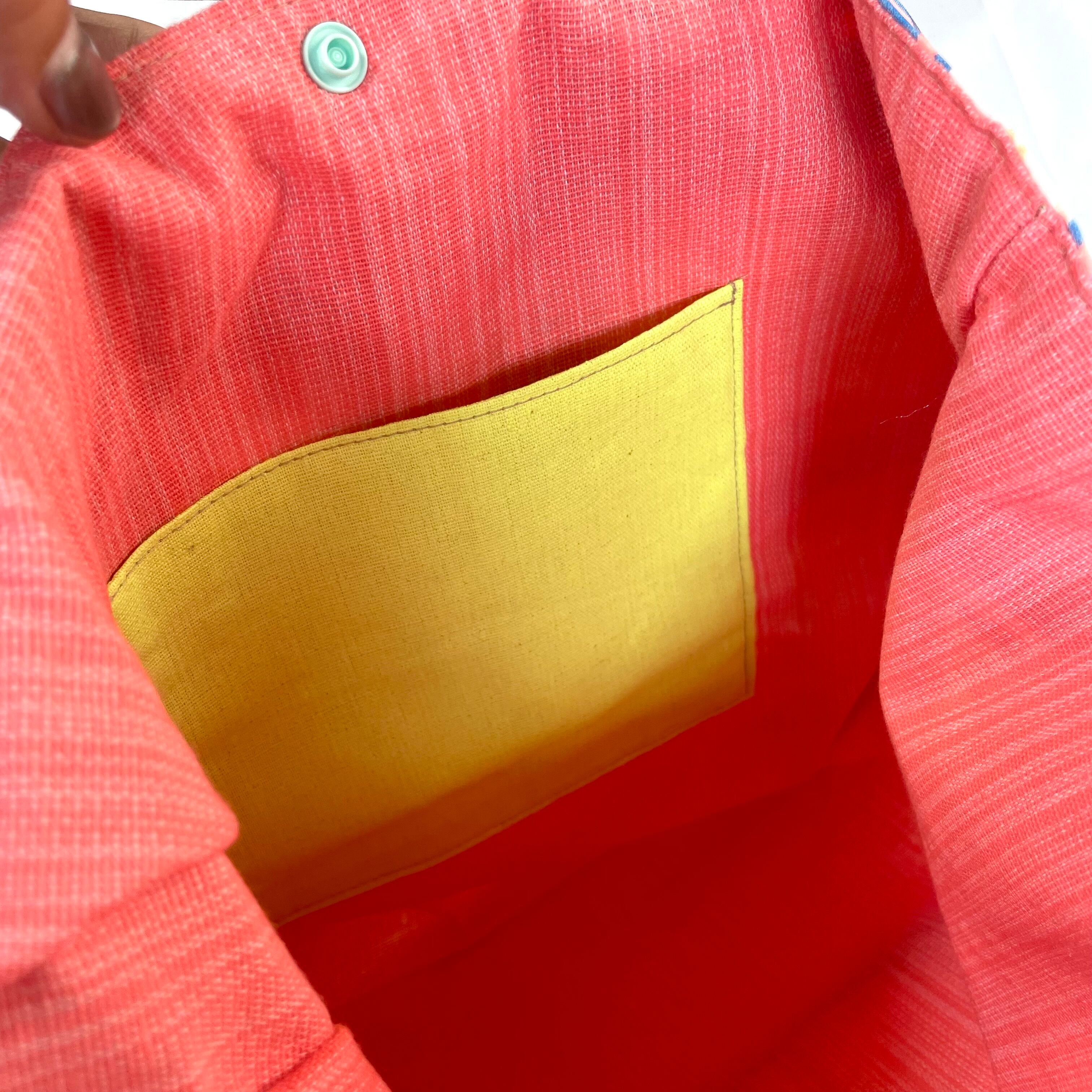 内側はサーモンピンクコットン生地にネオンイエローのポケットが1つ付いています。