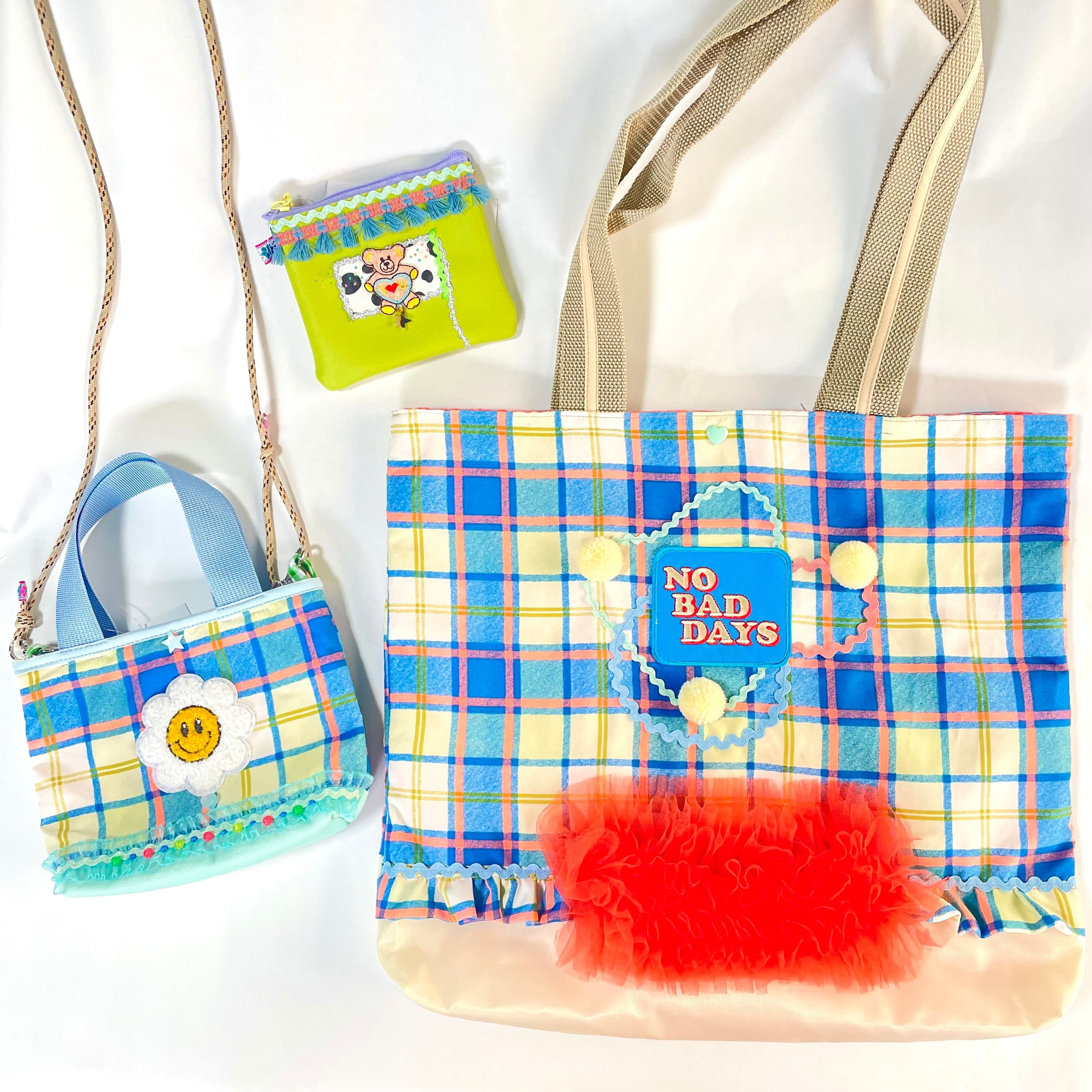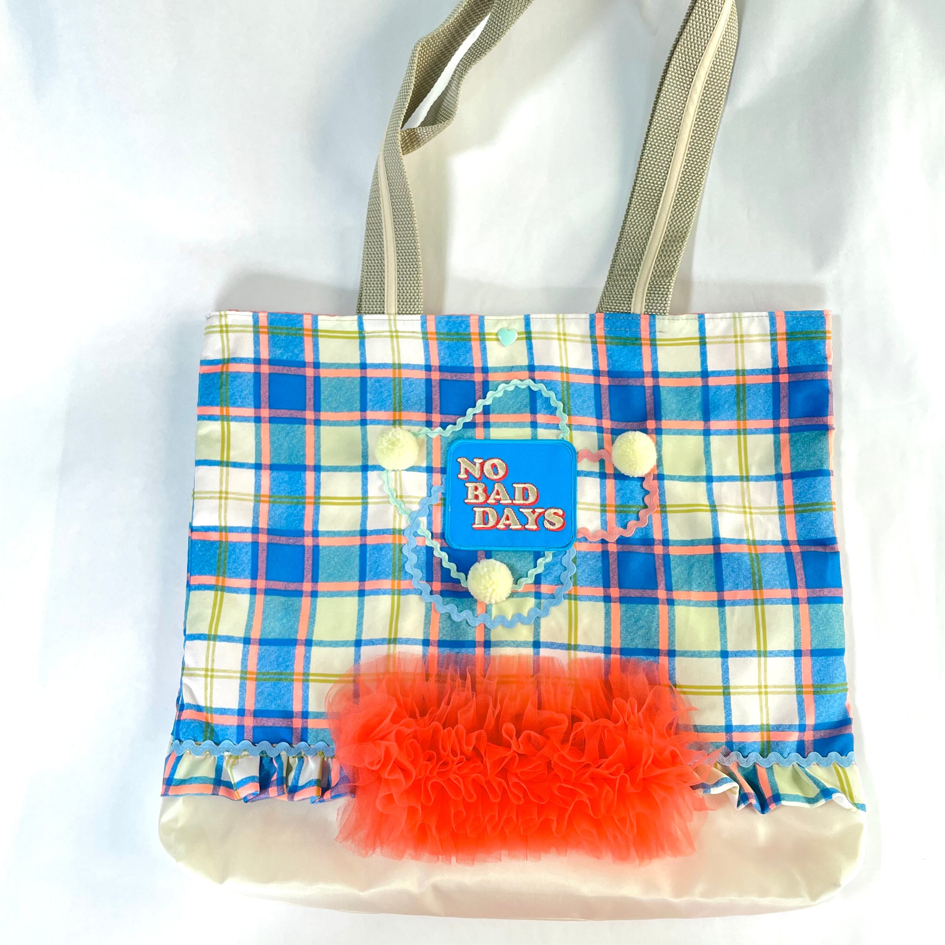 ネオンオレンジとブルーがかわいいブロックチェック生地にワッペンとなみなみテープ、ボリュームのあるチュールフリルをつけたトートバッグです。