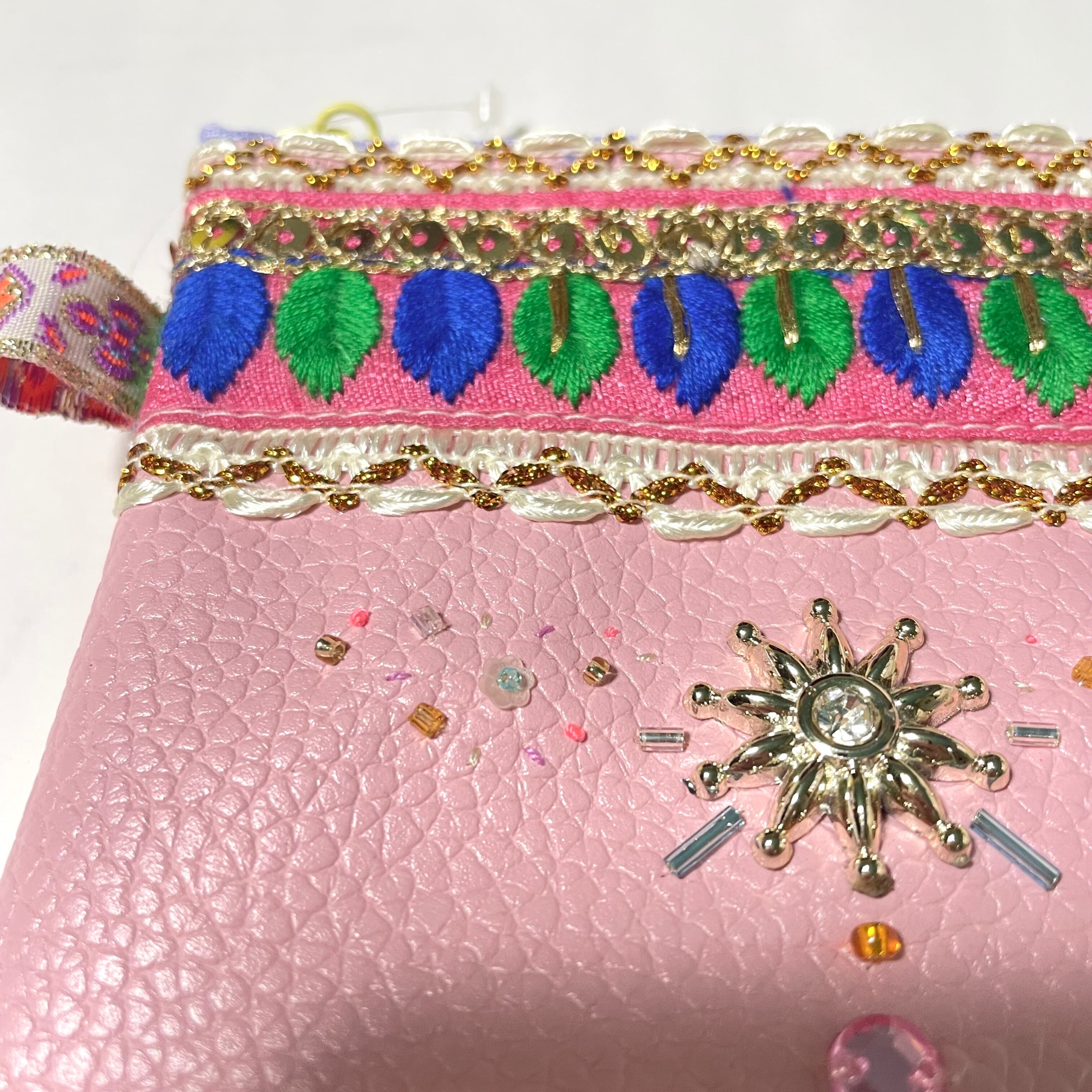 かわいいパーツとビジューや細かいビーズがたくさんついたフェイクレザーで軽い持ち心地のパスケース。