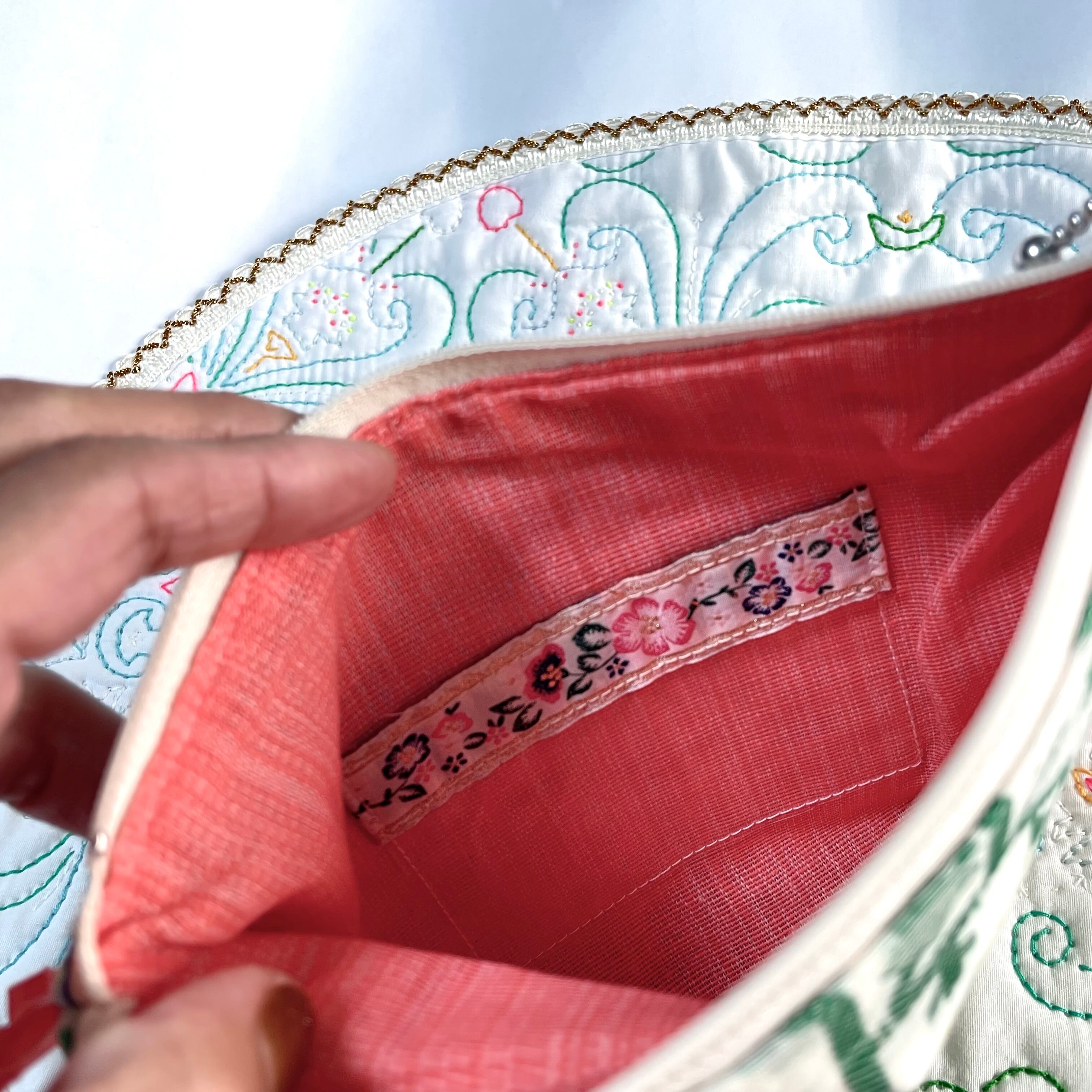 内側もチェンマイコットン生地にポケットが1つ付いています。カラーはサーモンピンクです。
