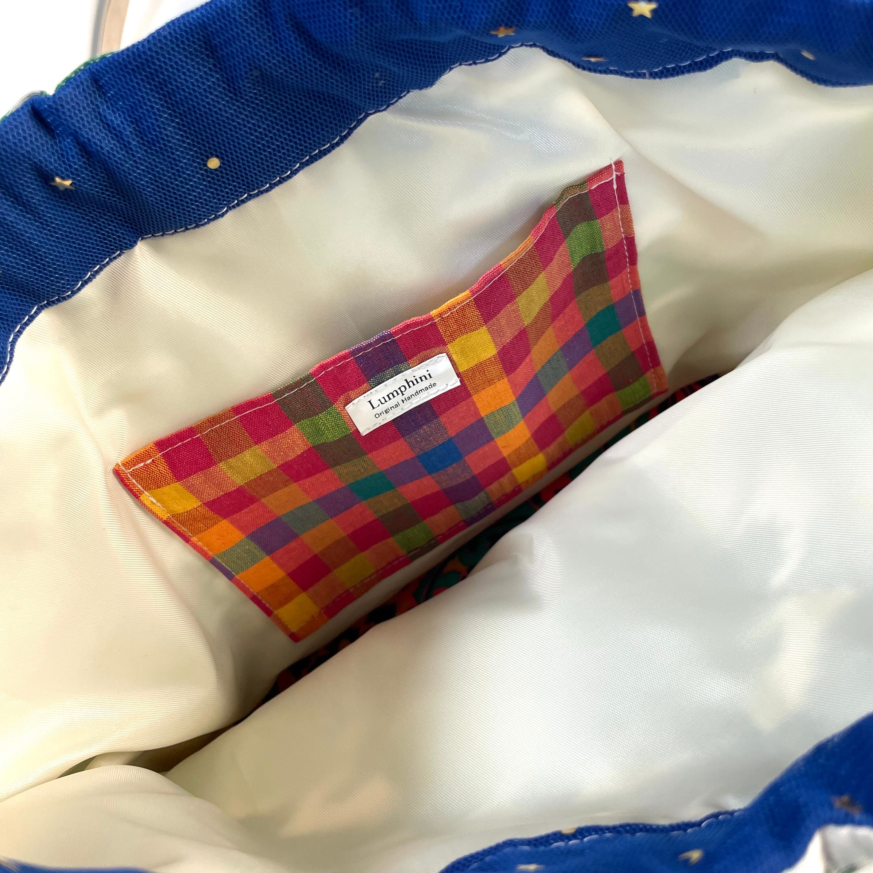 アイボリーにグリーンの糸と柄がかわいい織物生地にライトブルーでボリュームのあるチュールフリルを組み合わせた巾着トート。