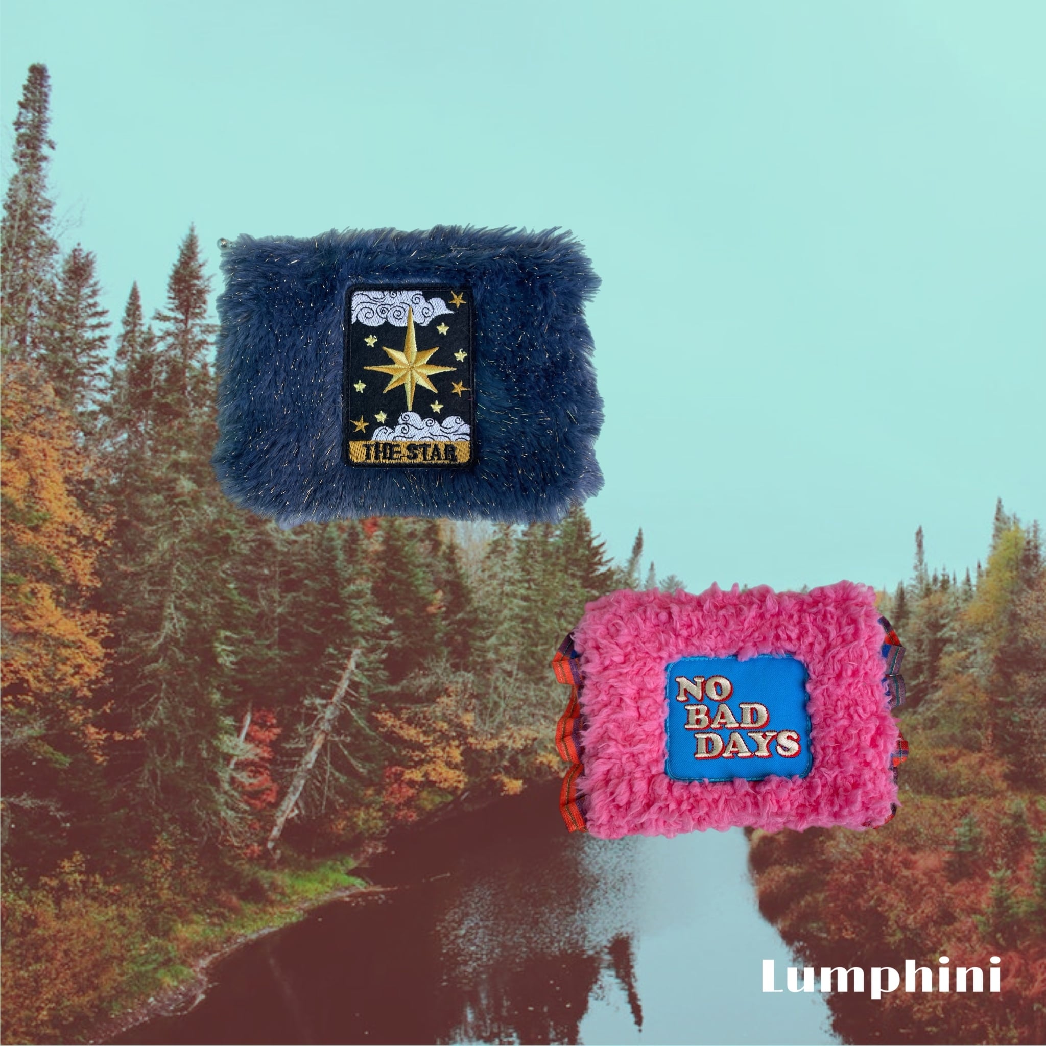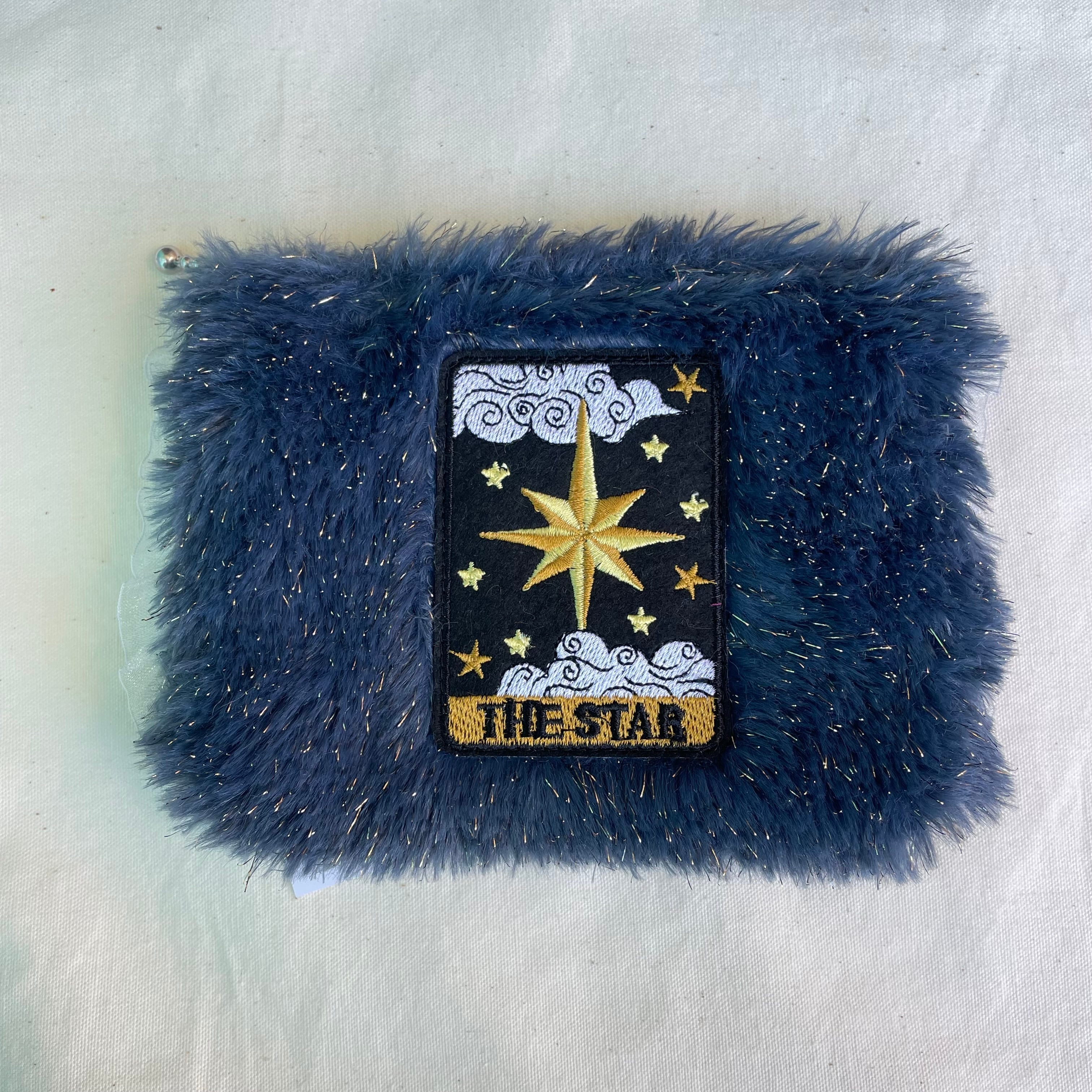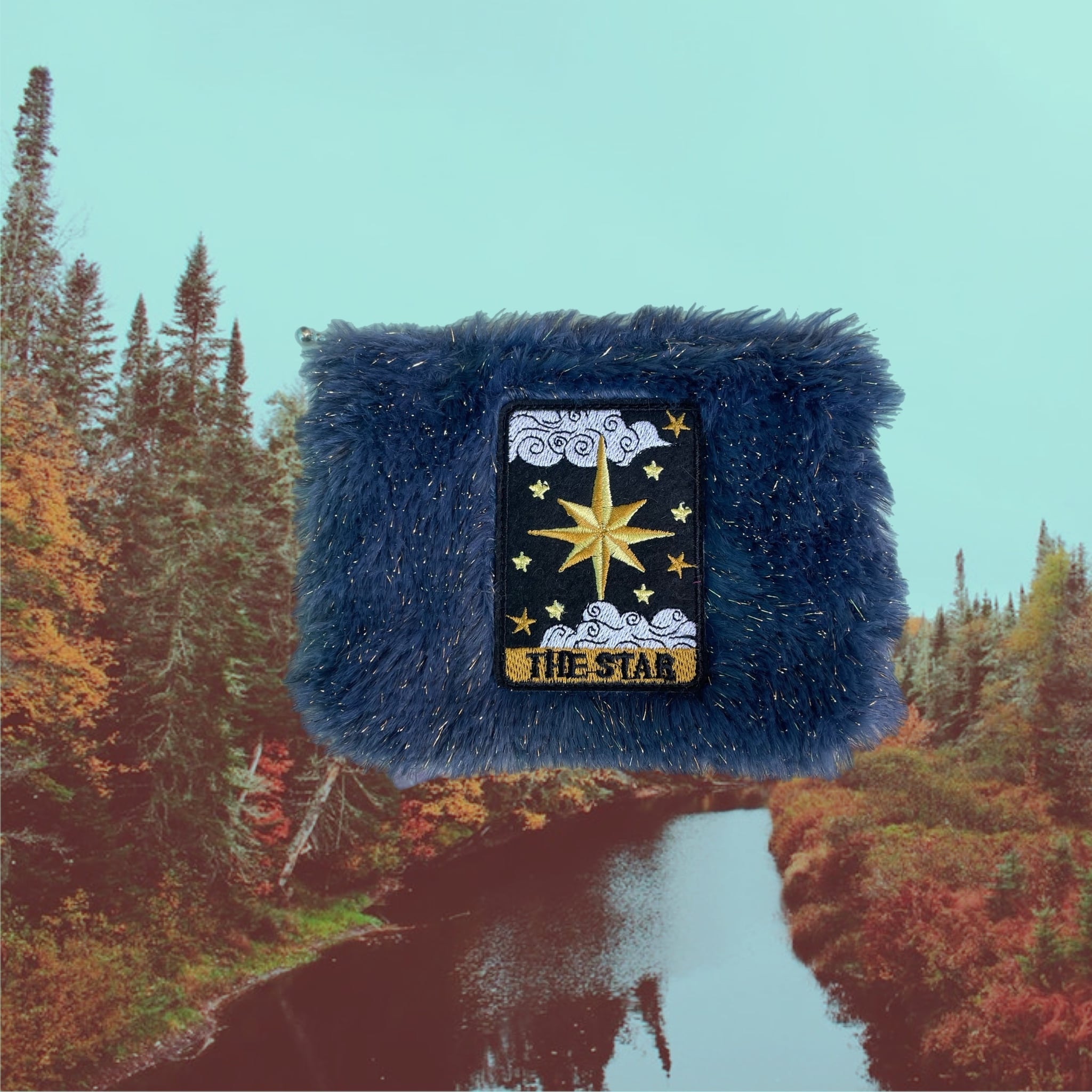 ネイビーにゴールドがMixされたファー素材にタロットカードからインスパイアされたデザインが素敵なワッペンがついています。