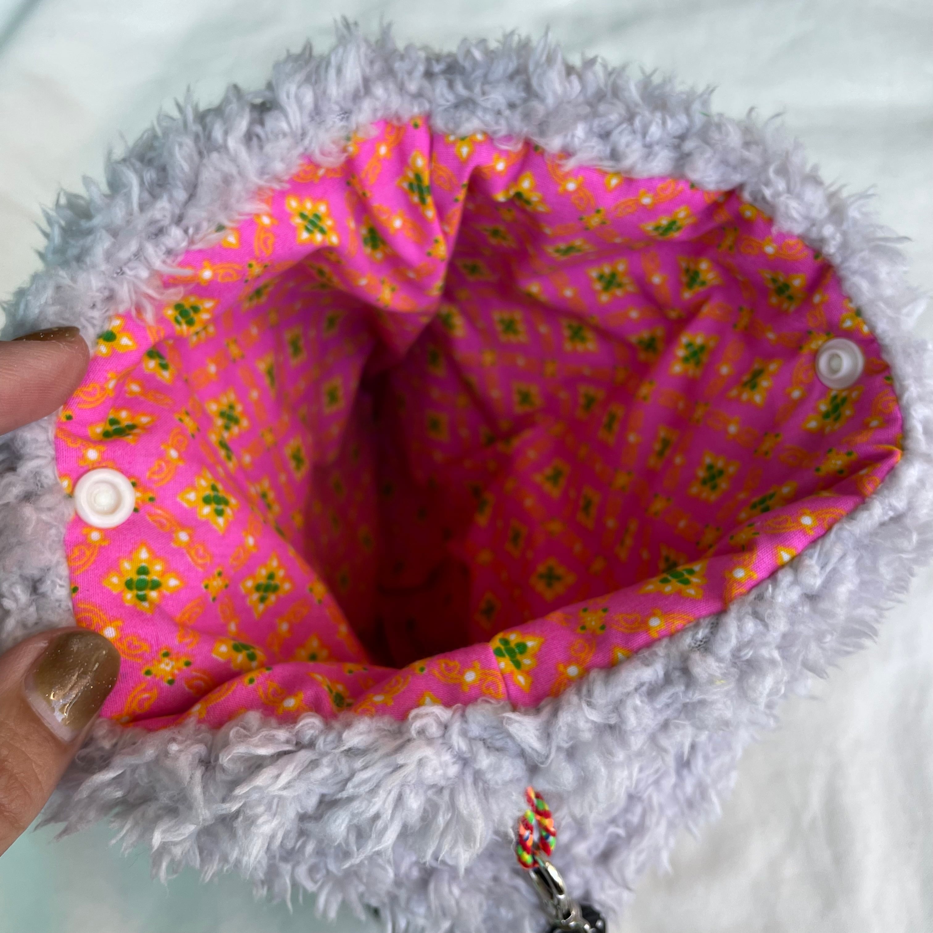 ラベンダーボアと鮮やかなインド刺繍生地を組み合わせた目を惹くミニショルダーです。
