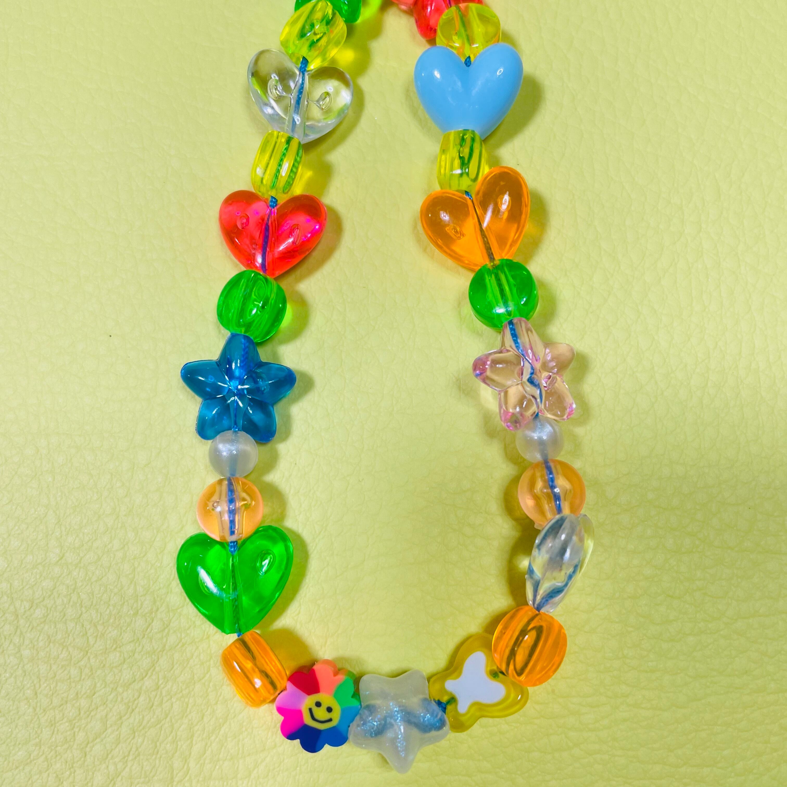 鮮やかなレインボーカラーに、ハートやスターのモチーフをミックス。ポップなデザインながら、透明感のある素材を一粒一粒、贅沢に繋ぎました。