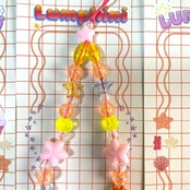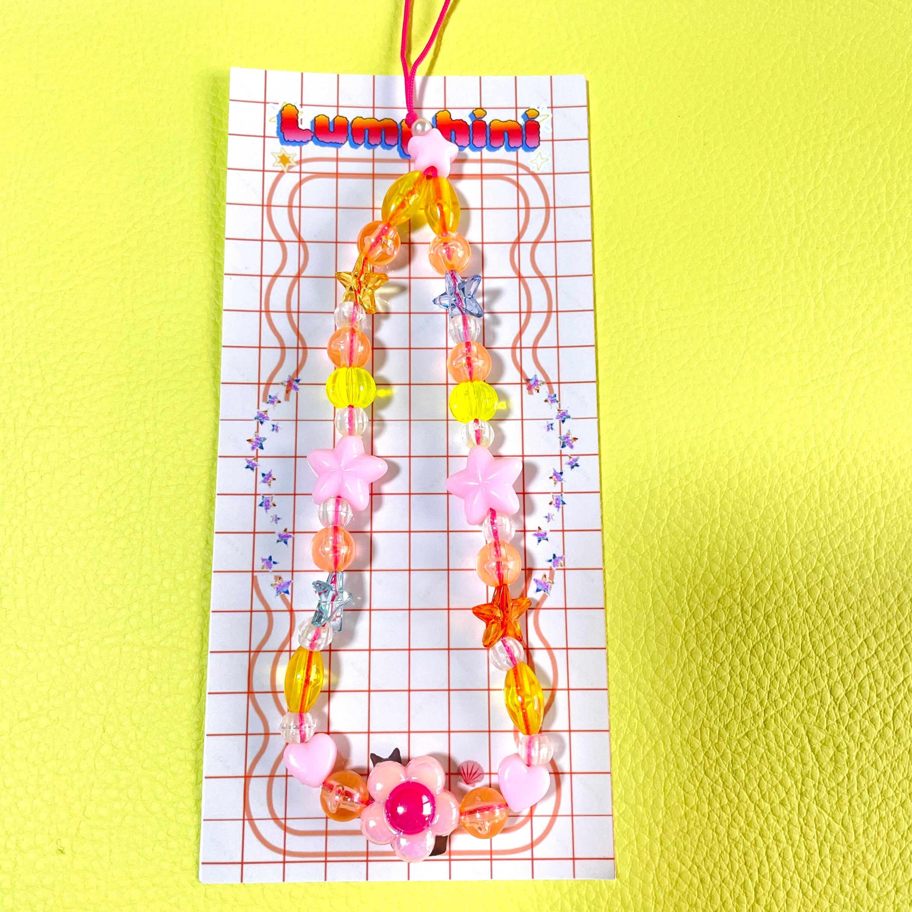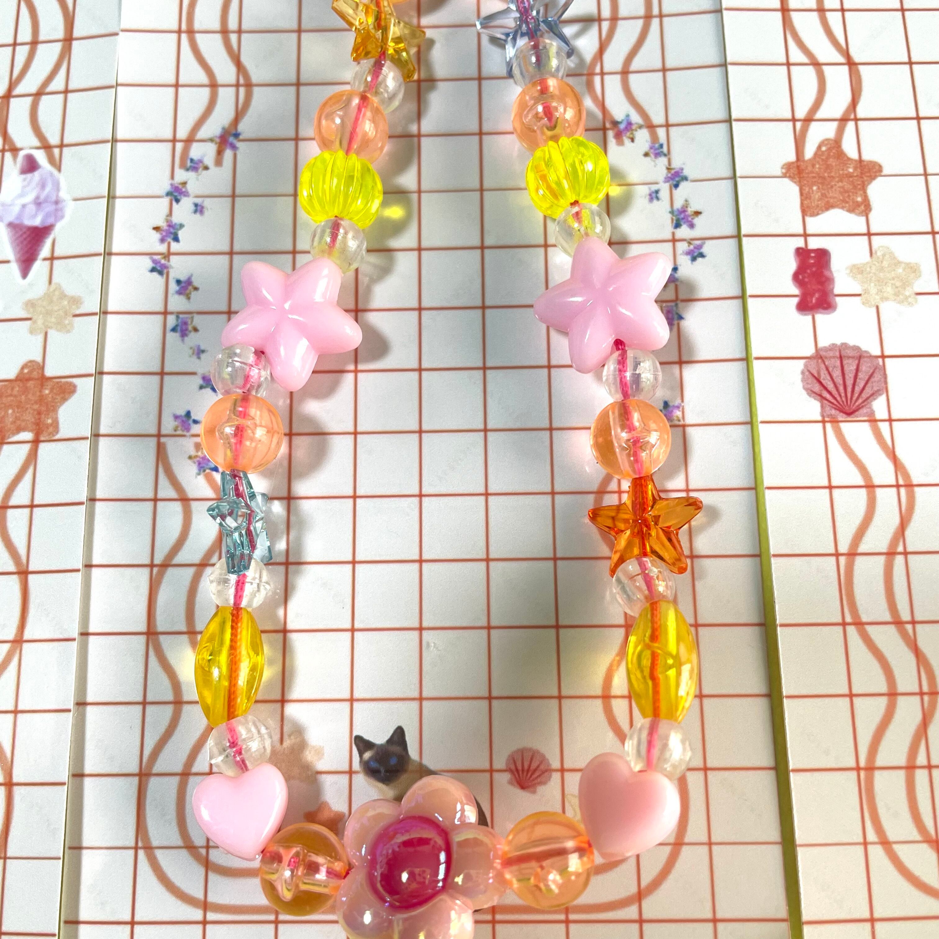 ネオンクリアカラーの組み合わせに、ハートやスターのモチーフをミックス。ポップなデザインながら、透明感のある素材を一粒一粒、贅沢に繋ぎました。