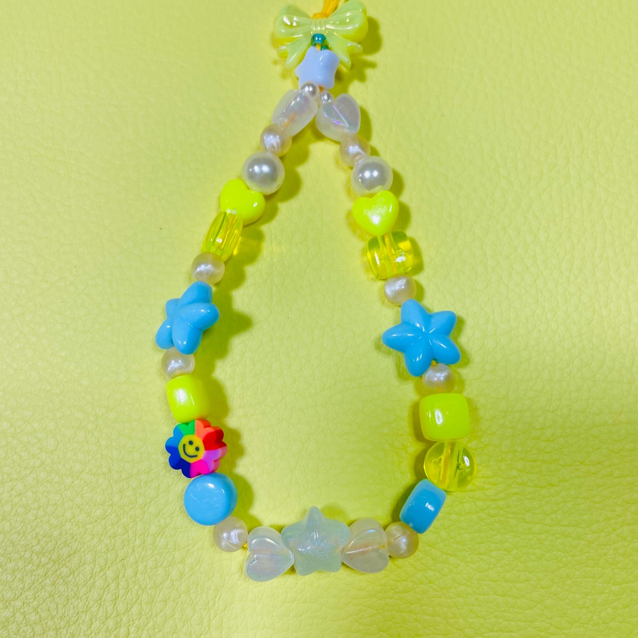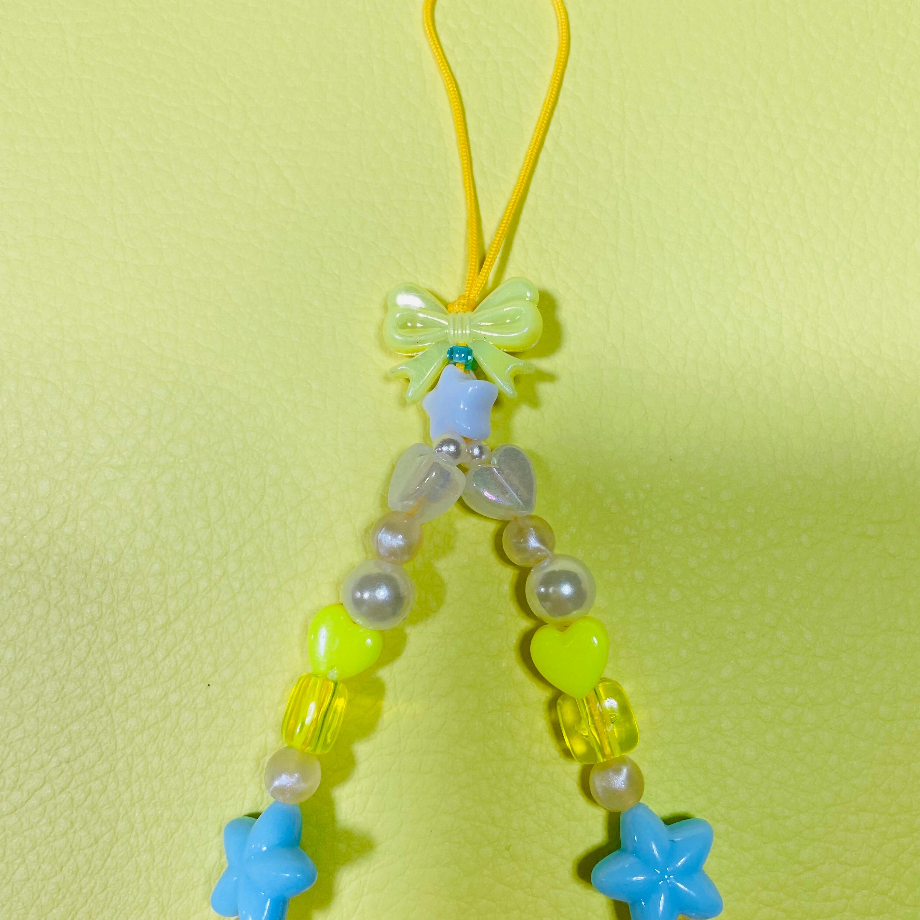 パール風ビーズとイエローベースの組み合わせに、ハートやスターのモチーフをミックス。ポップなデザインながら、透明感のある素材を一粒一粒、贅沢に繋ぎました。