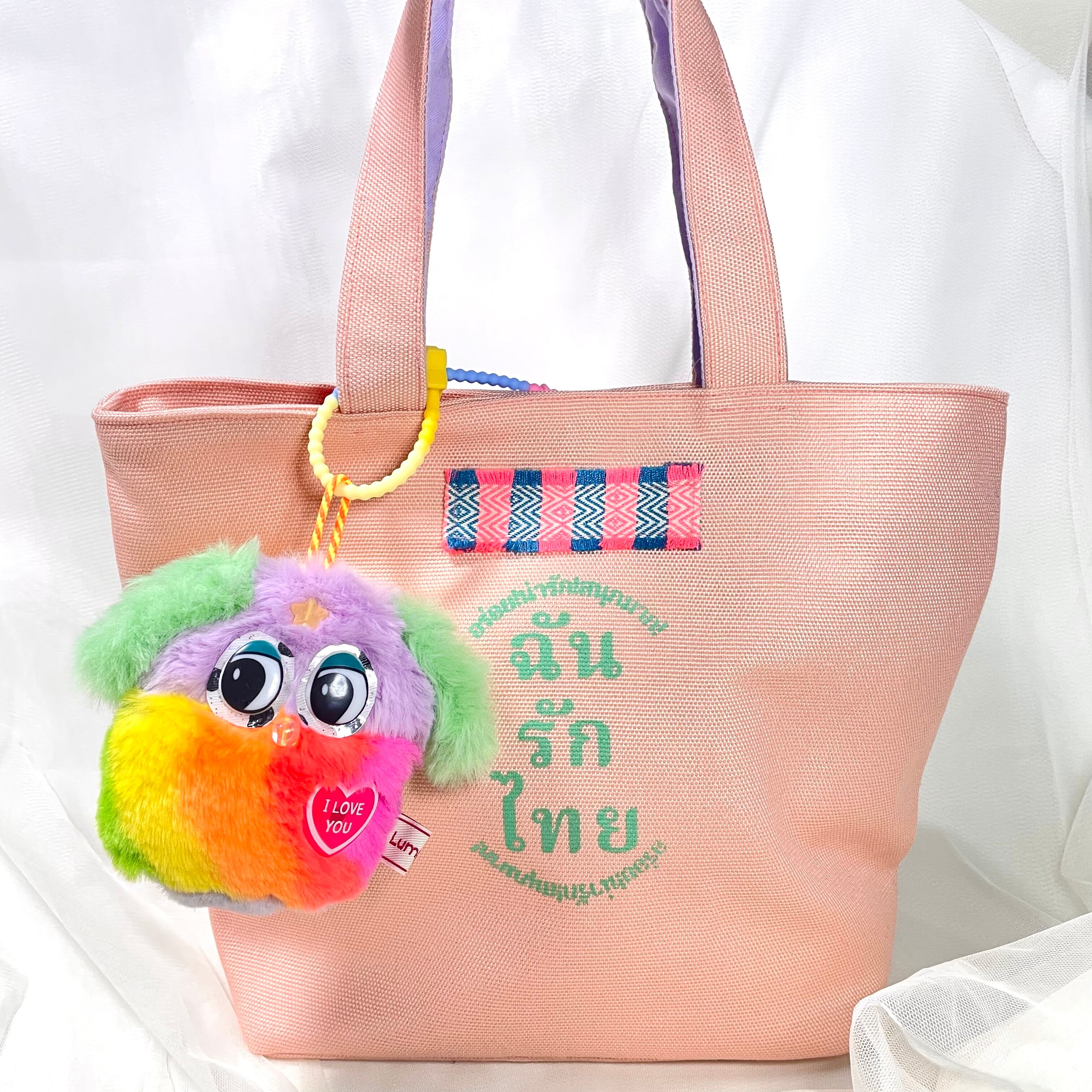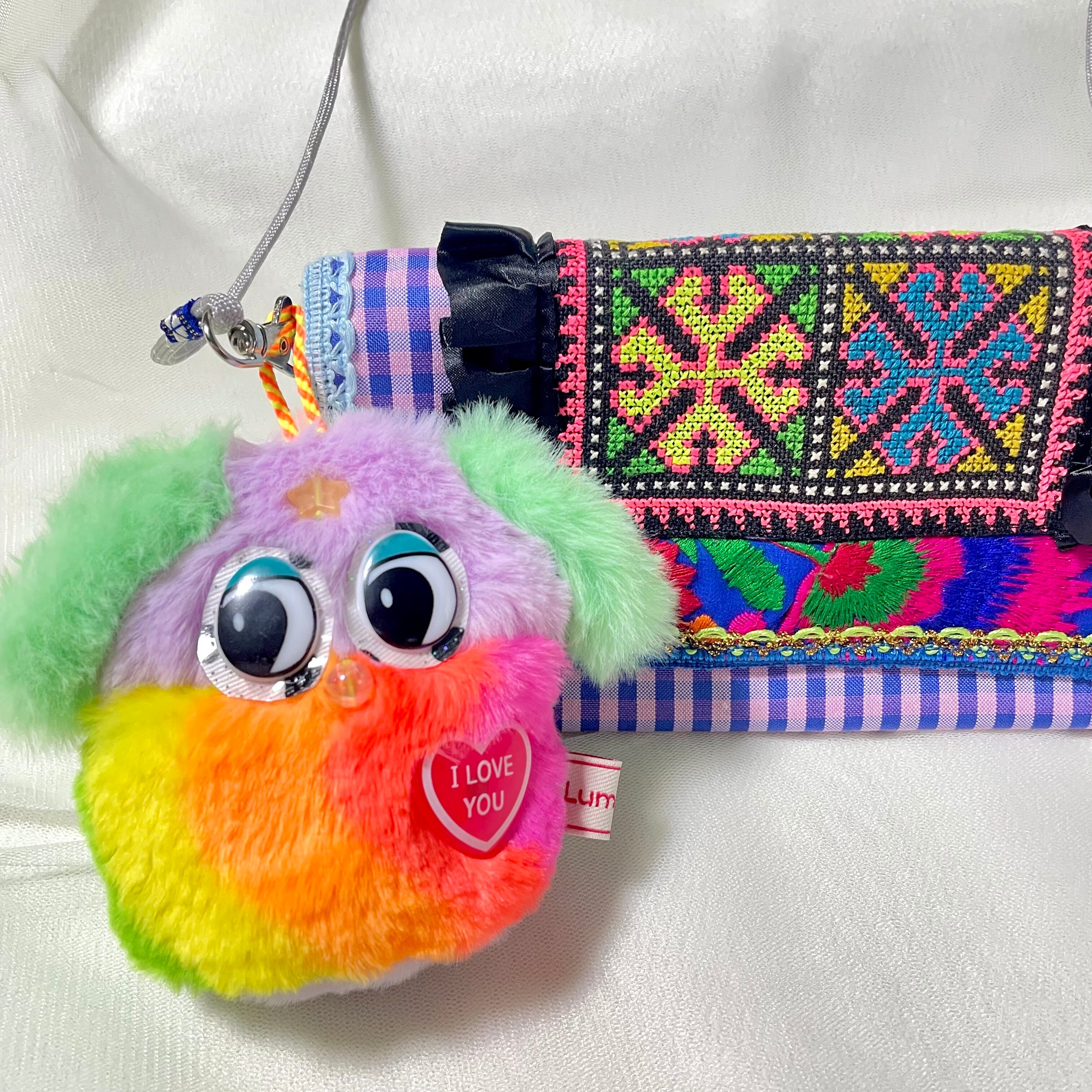 タイのカラフルな糸を一針一針丁寧に手刺繍したワッペンと、遊び心あふれるカラーリングが魅力の、ハンドメイドぬいぐるみチャームです。