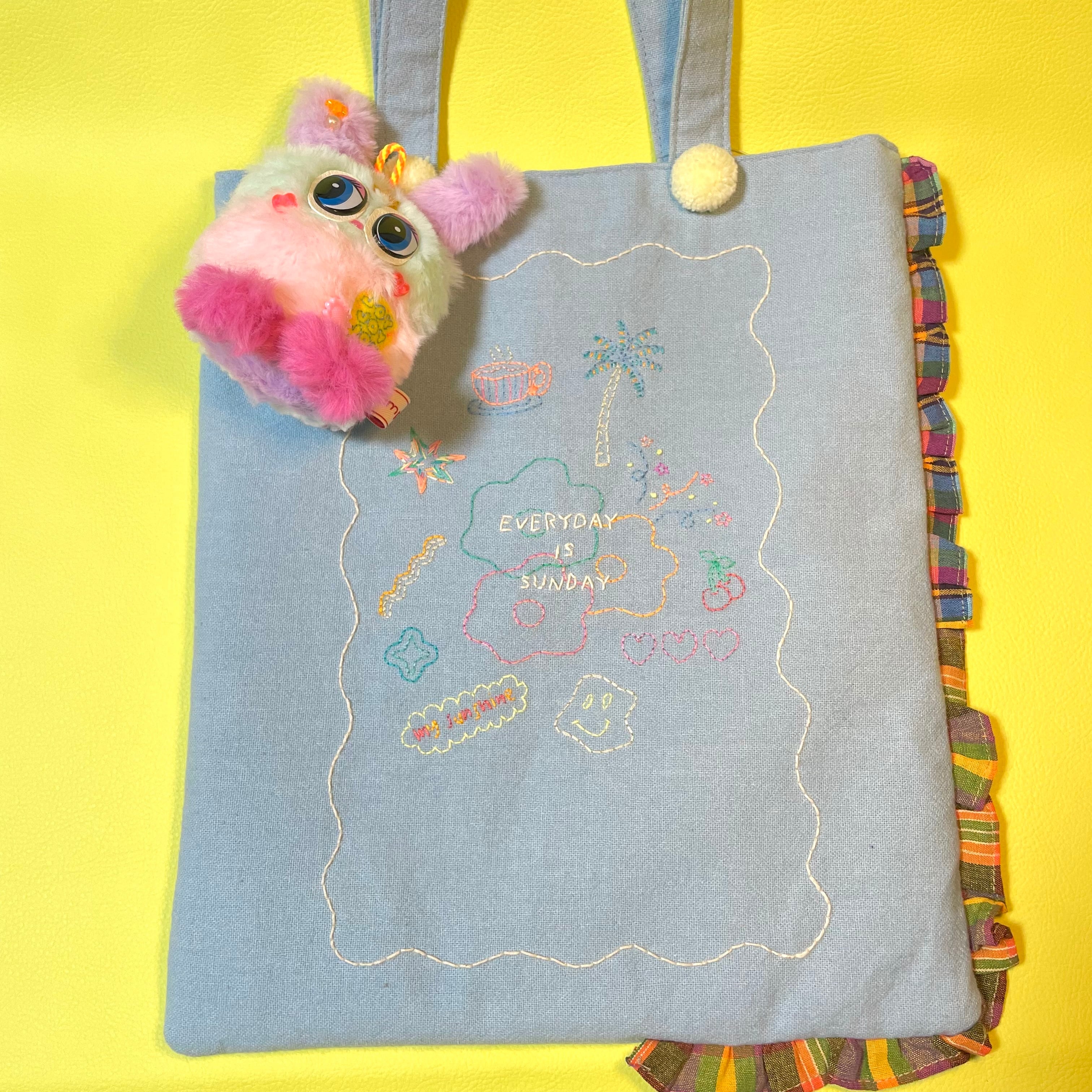 タイのカラフルな糸を一針一針丁寧に手刺繍したワッペンと、遊び心あふれるカラーリングが魅力の、ハンドメイドぬいぐるみチャームです。