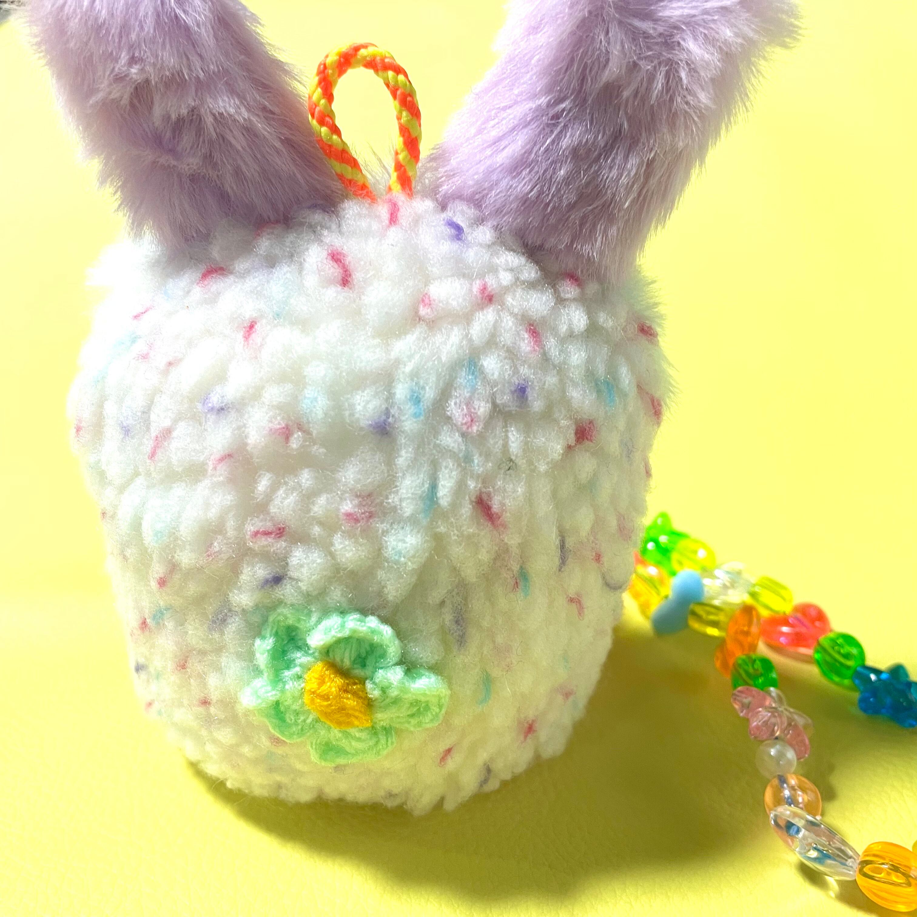 ラベンダーカラーのお耳にはキラリと光るビーズ、足元には濃いピンクのふわふわを纏い、お洒落も全力で楽しむ欲張りなデザインに仕上げました。