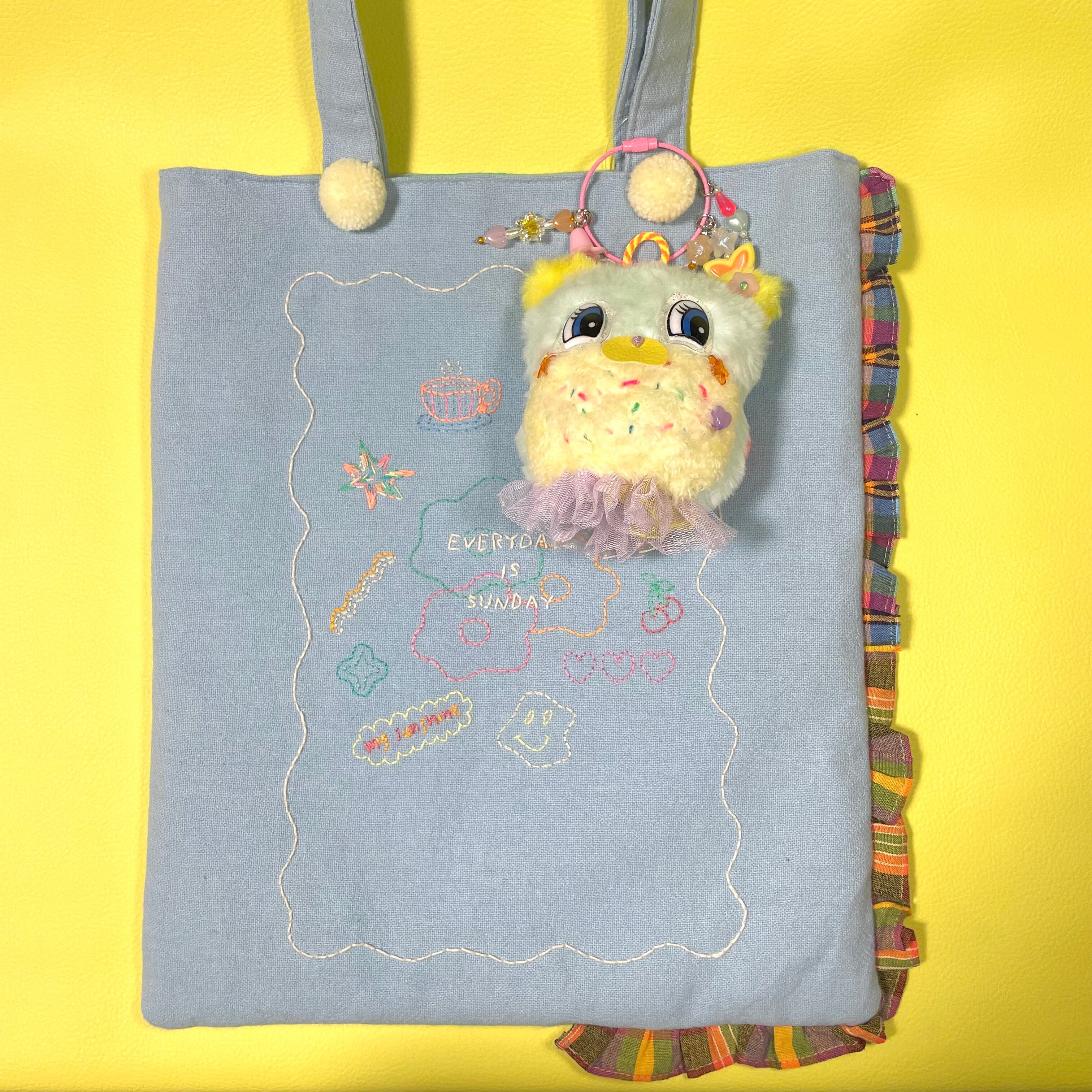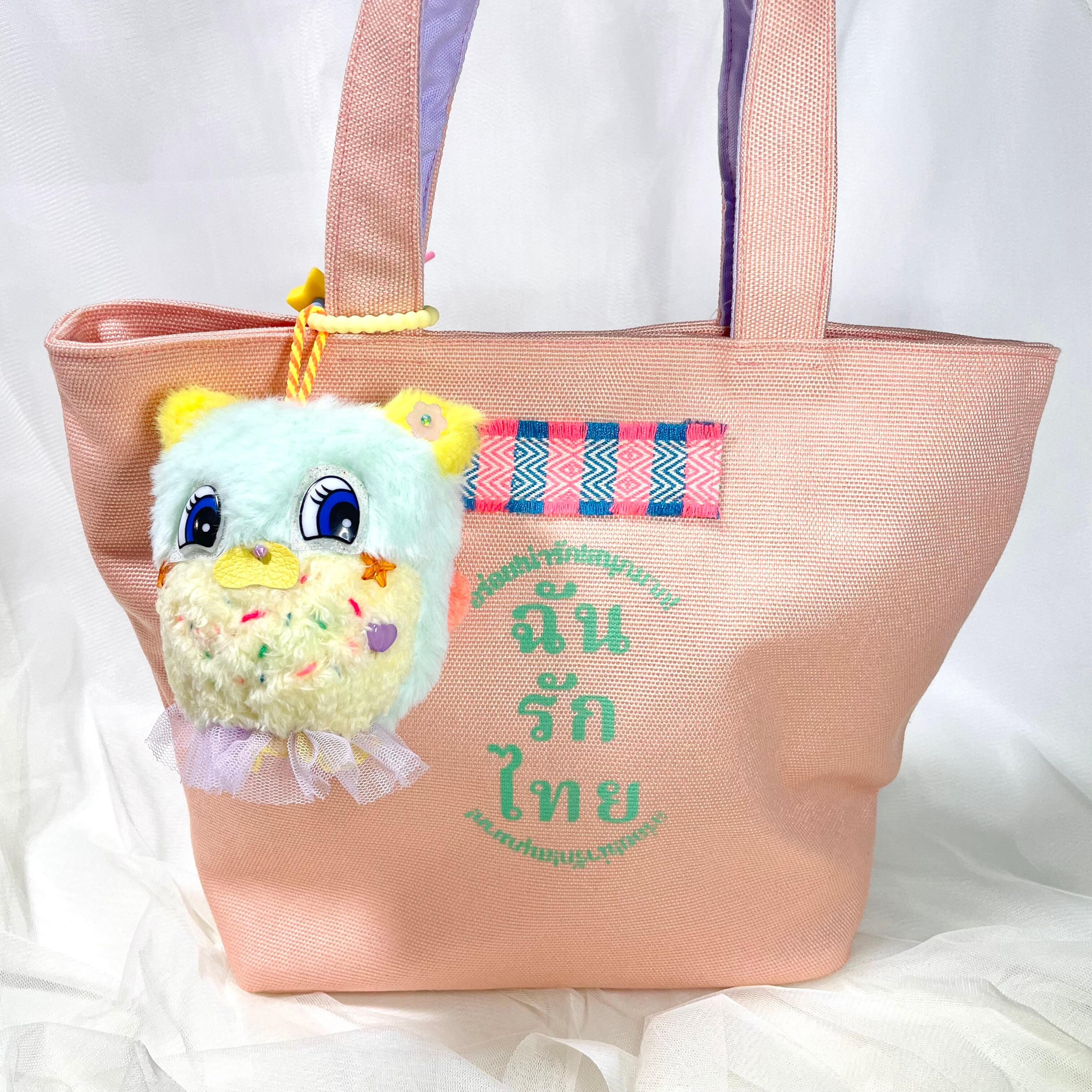 タイのカラフルな糸を一針一針丁寧に手刺繍したワッペンと、遊び心あふれるカラーリングが魅力の、ハンドメイドぬいぐるみチャームです。