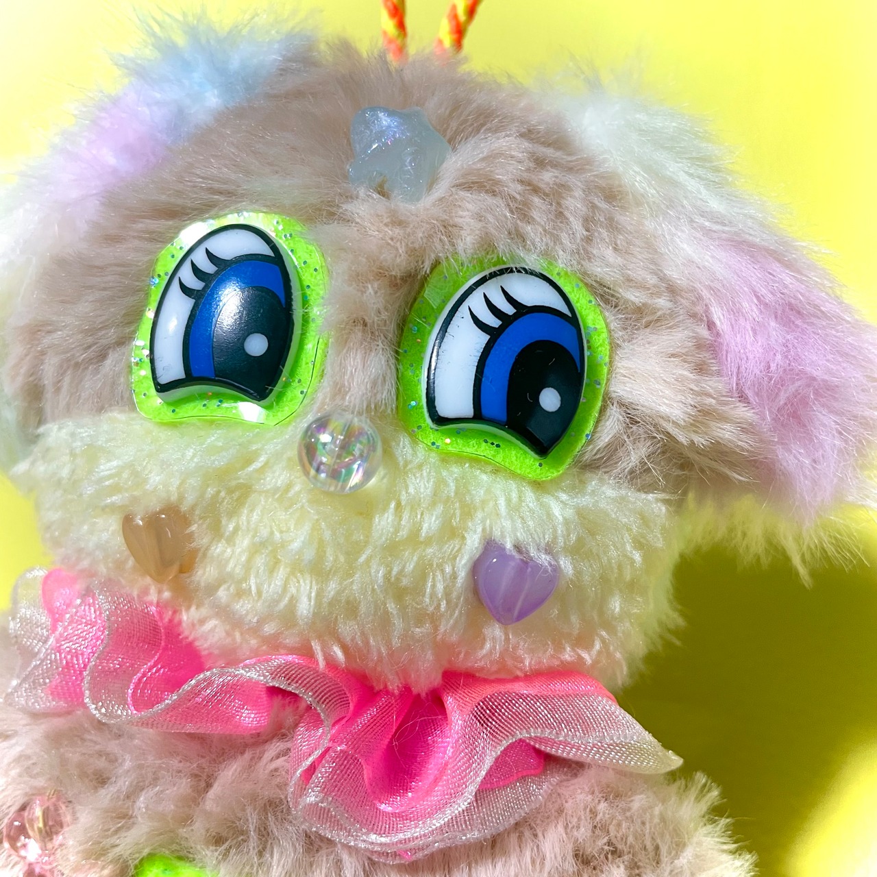 淡いパステルピンクのレインボーカラーで仕立てたふわふわなお耳とネオンピンクのフリルが夢のような彩りを添えています。