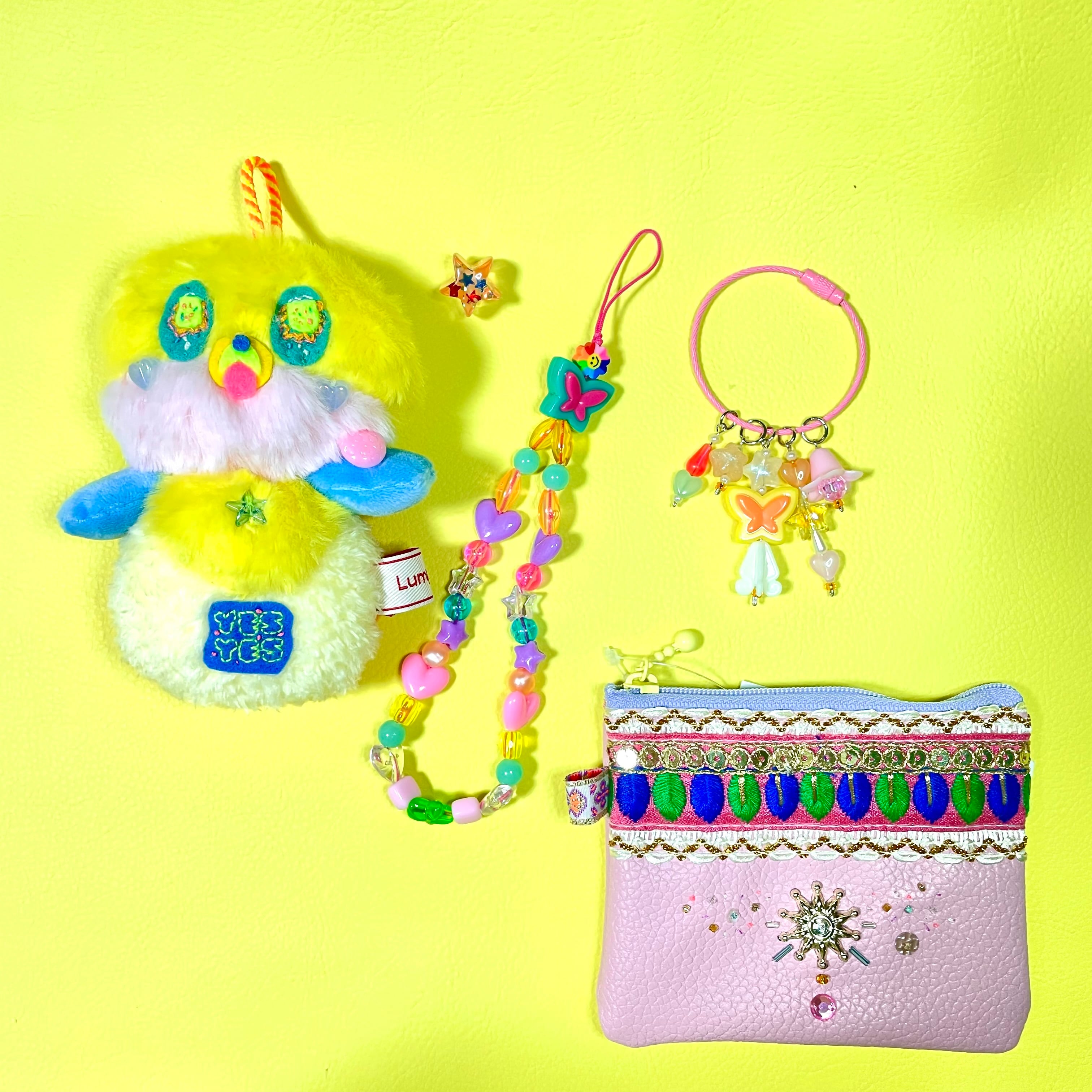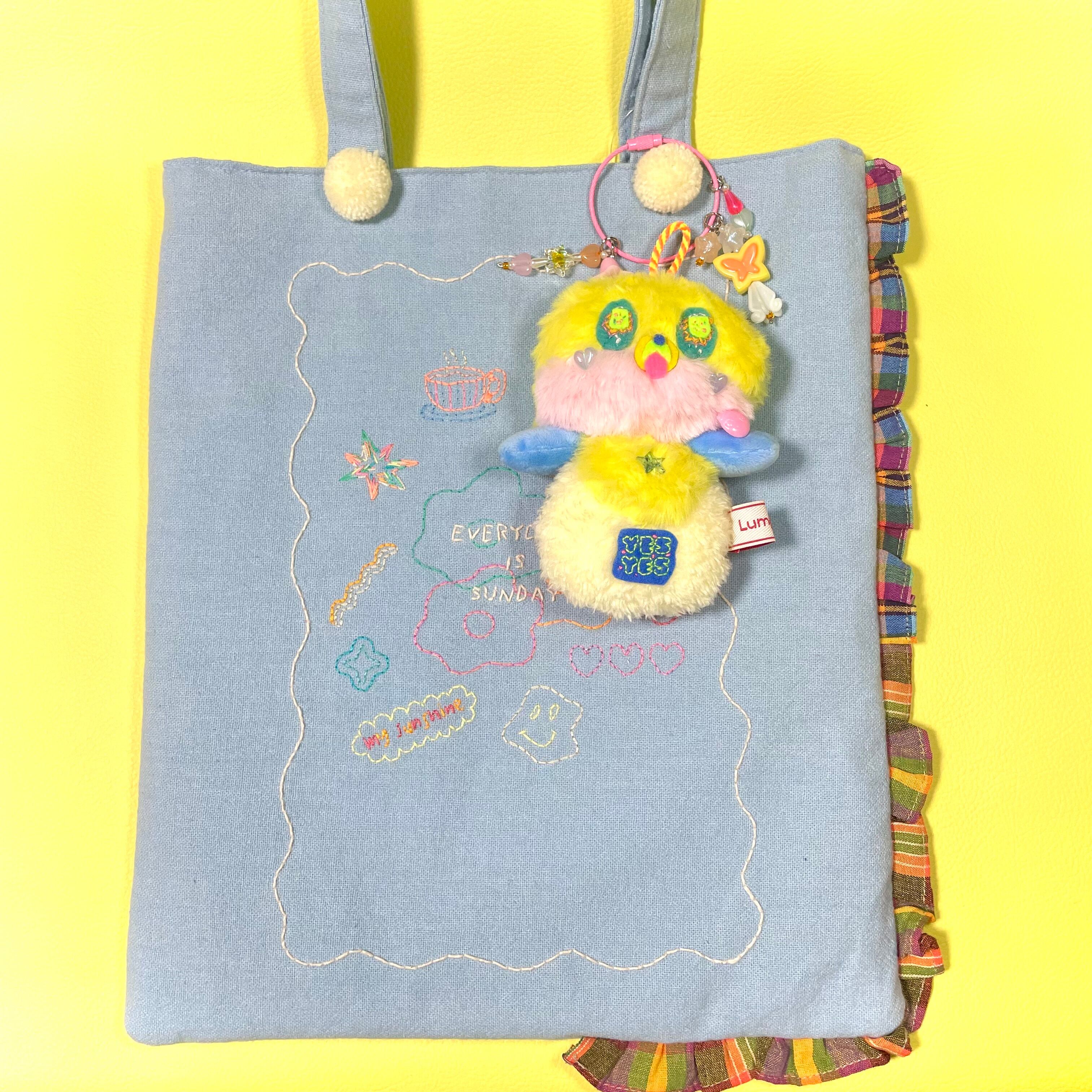 タイのカラフルな糸を一針一針丁寧に手刺繍したワッペンと、遊び心あふれるカラーリングが魅力の、ハンドメイドぬいぐるみチャームです。