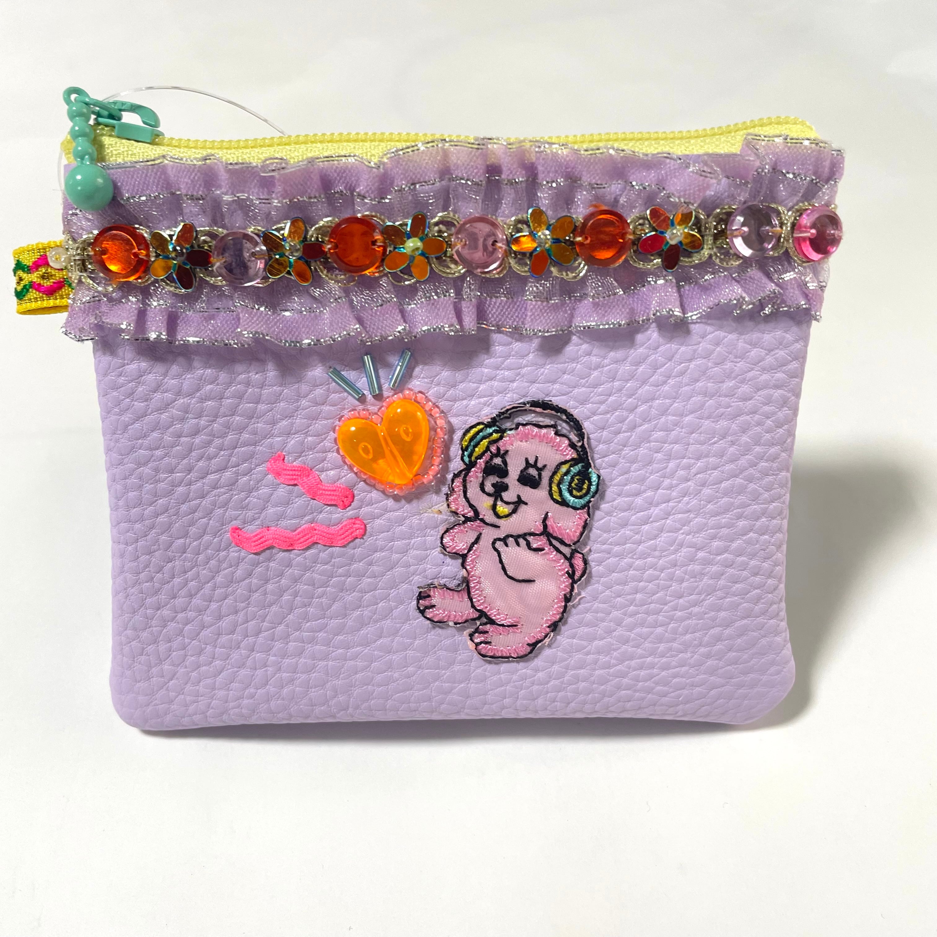綺麗なラベンダーカラーにレトロなワッペンとビーズがかわいいフェイクレザーで軽い持ち心地のパスケース。