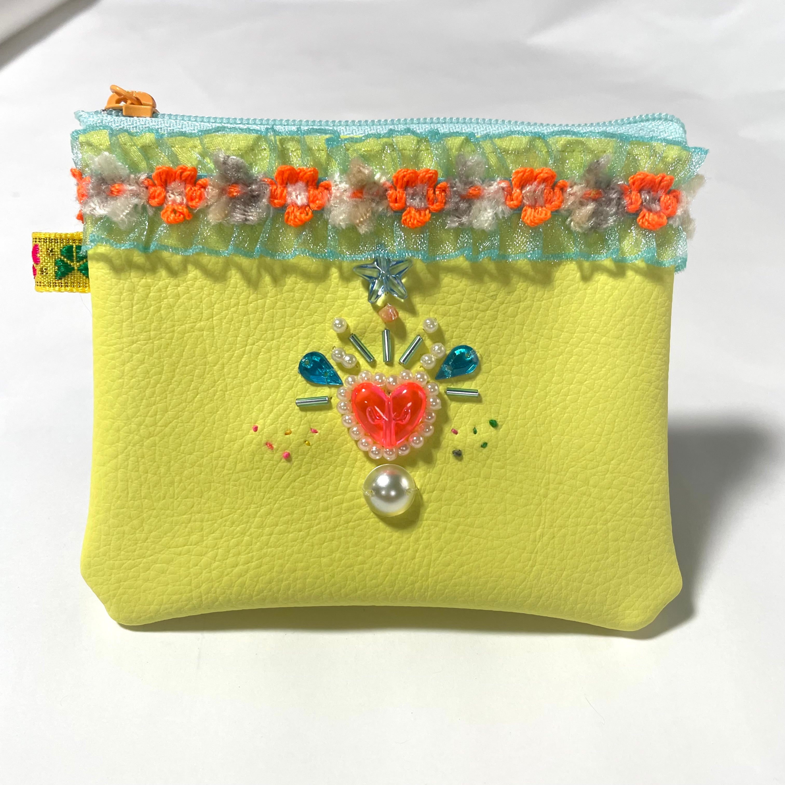 明るいイエローにレトロなハートビーズとお花テープがかわいいフェイクレザーで軽い持ち心地のパスケース。