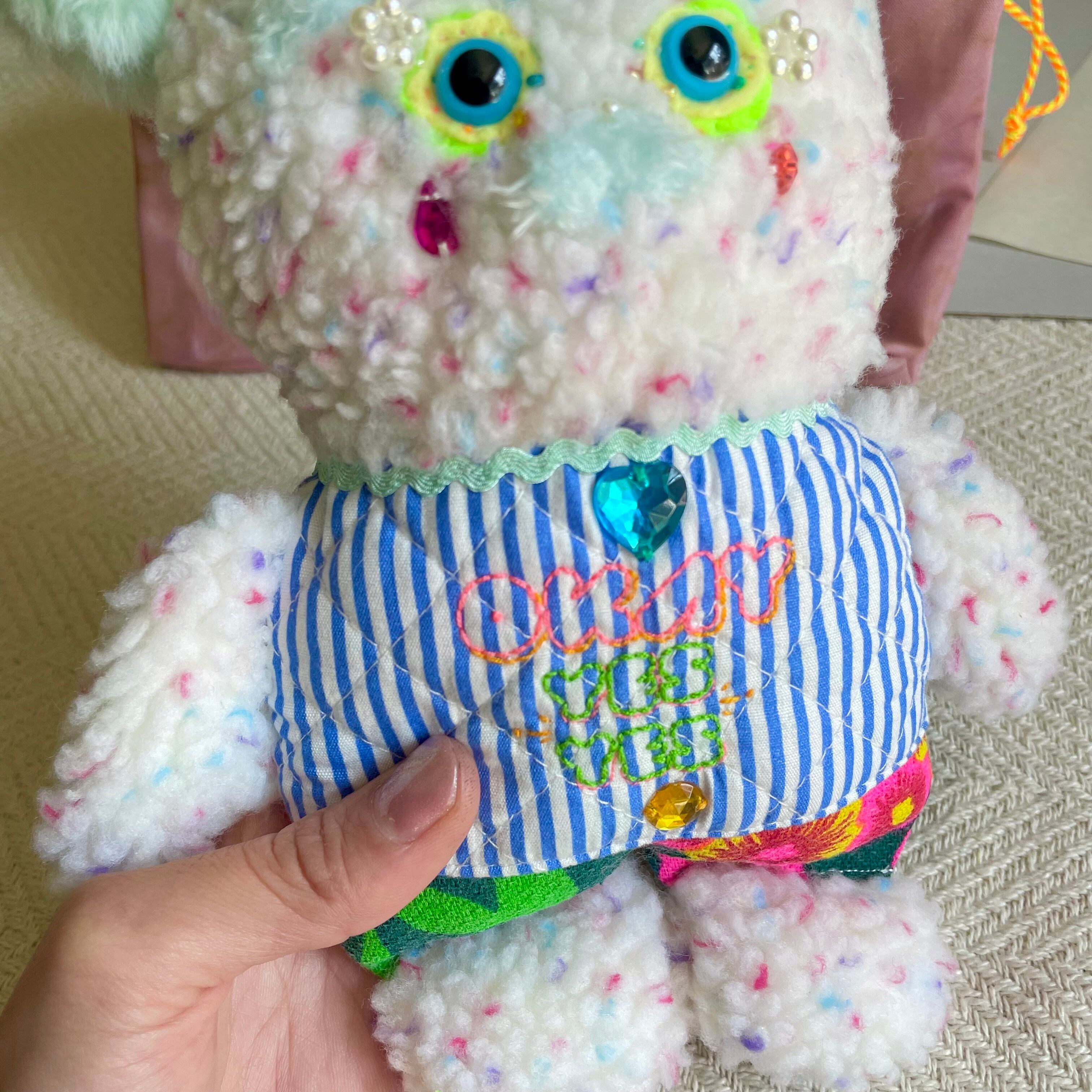 多種多様なボア、ファー、繊細な刺繍を組み合わせたミックスメディア作品。胸元にはその子だけが持つスペシャルな言葉が手刺繍されています。触れるたびに心を癒やす触覚芸術です。