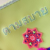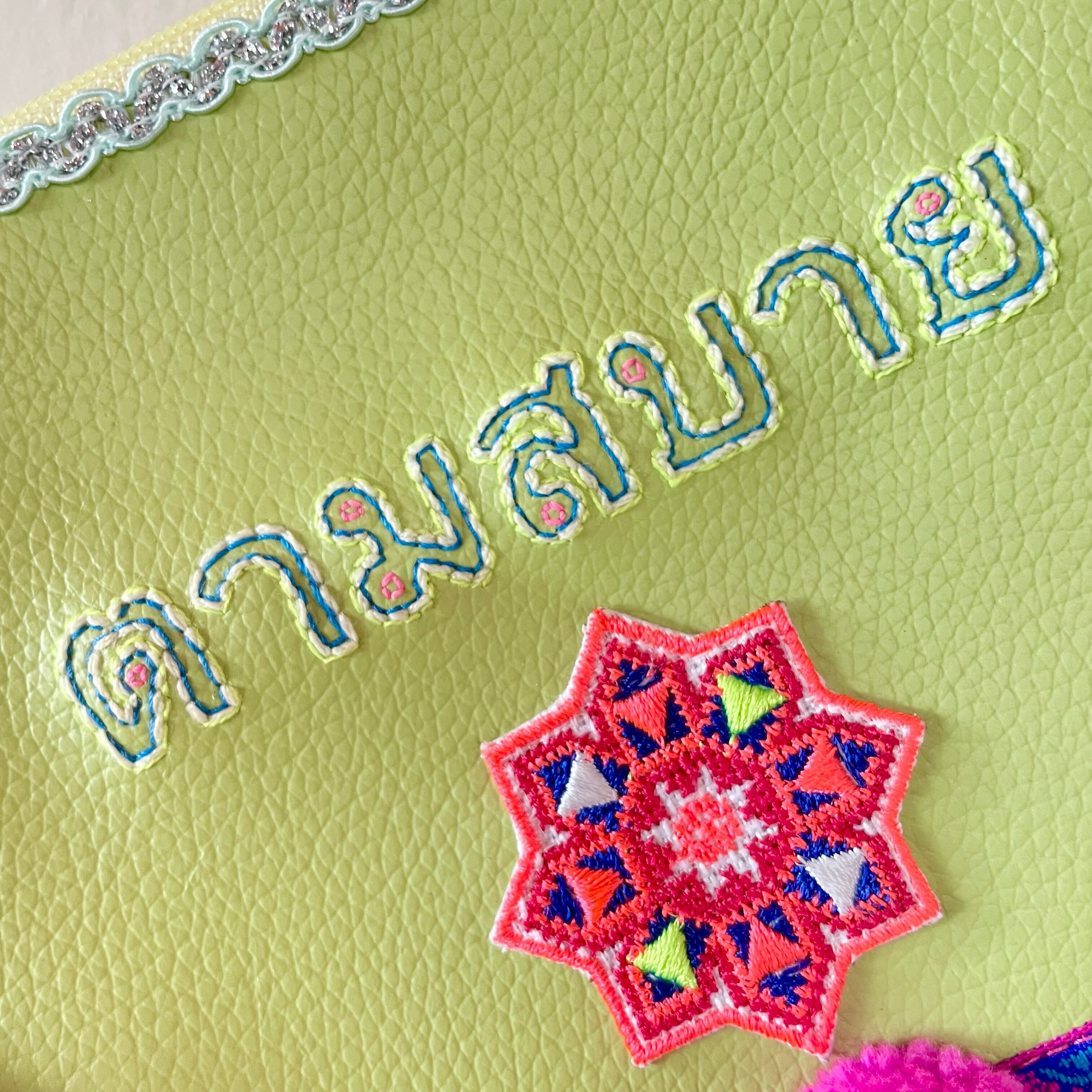 モン族刺繍ワッペンとポンポン、リボンを組み合わせて丁寧に1つずつ製作しています。