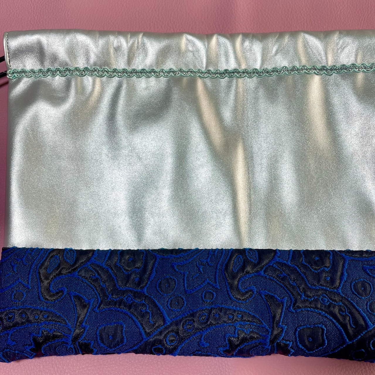シルバーの柔らかいフェイクレザーとエンボス加工が可愛い生地で仕上げた巾着バッグ。