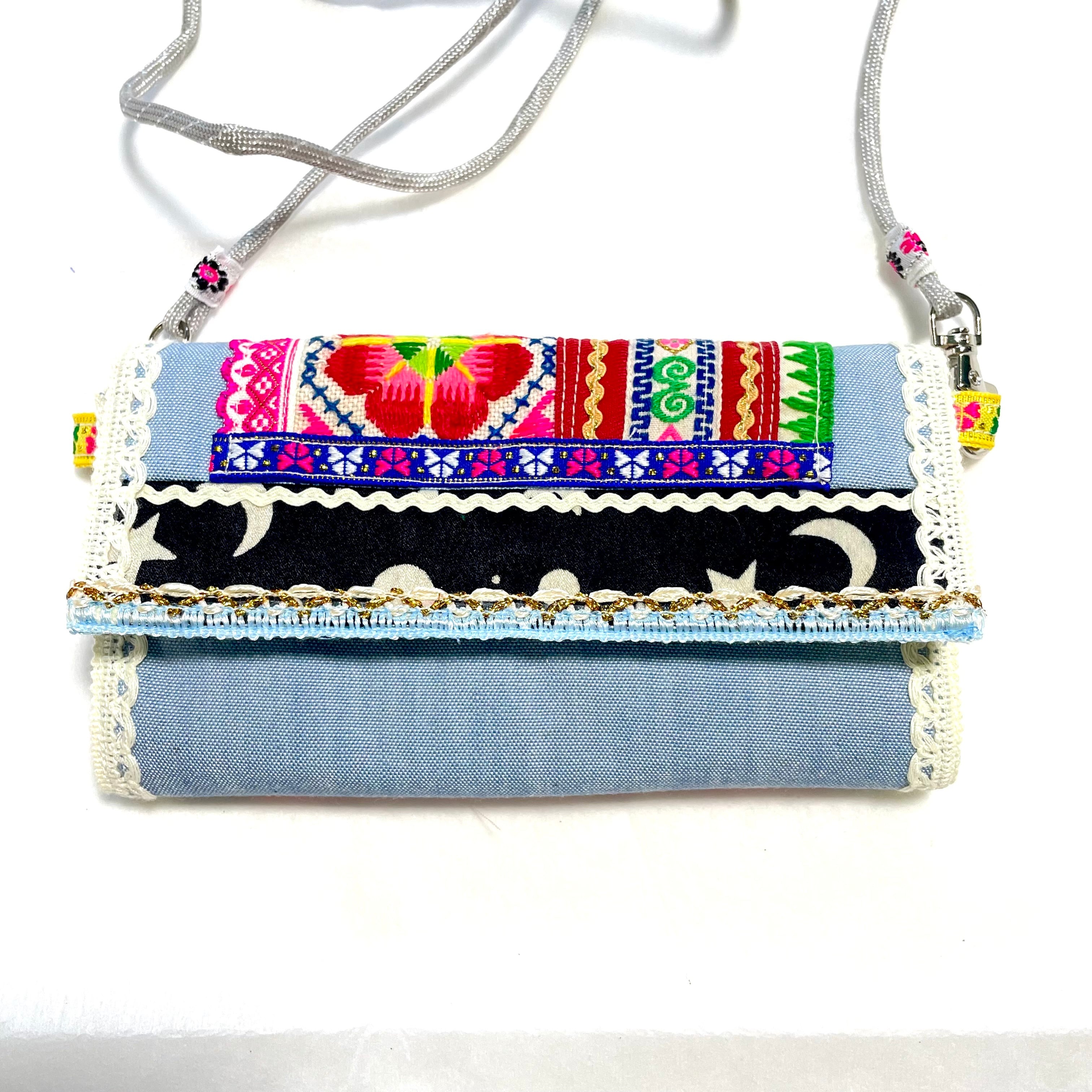 モン族手刺繍とブラックに星と月の柄がかわいい生地を組み合わせた1点もののデザインです。