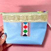 ペールブルーフェイクレザーに手刺繍で製作したフォントモチーフが付いたスペシャルなポーチ。