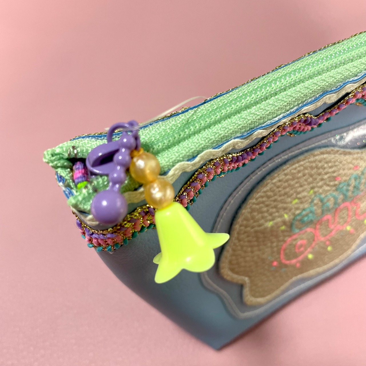 フォント刺繍周りには細かいカラフル刺繍やビーズ、ポンポンが付いた楽しいかわいいデザインです。