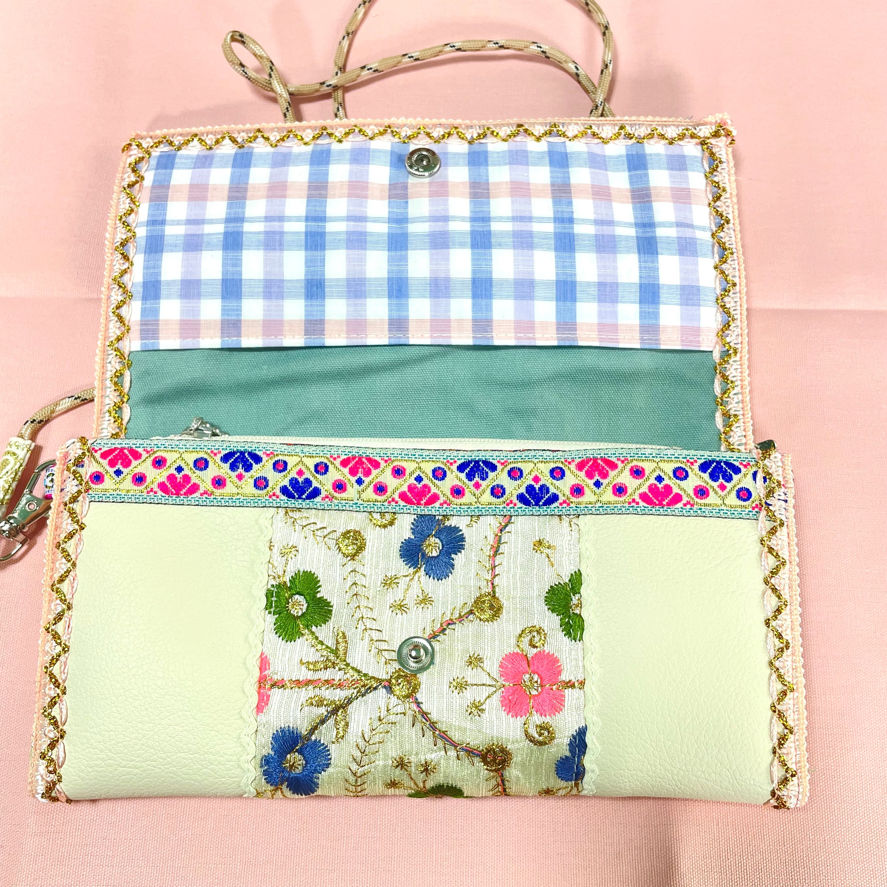 アイボリーのフェイクレザーにインドのお花柄生地を組み合わせたスペシャルなウォレットです。
