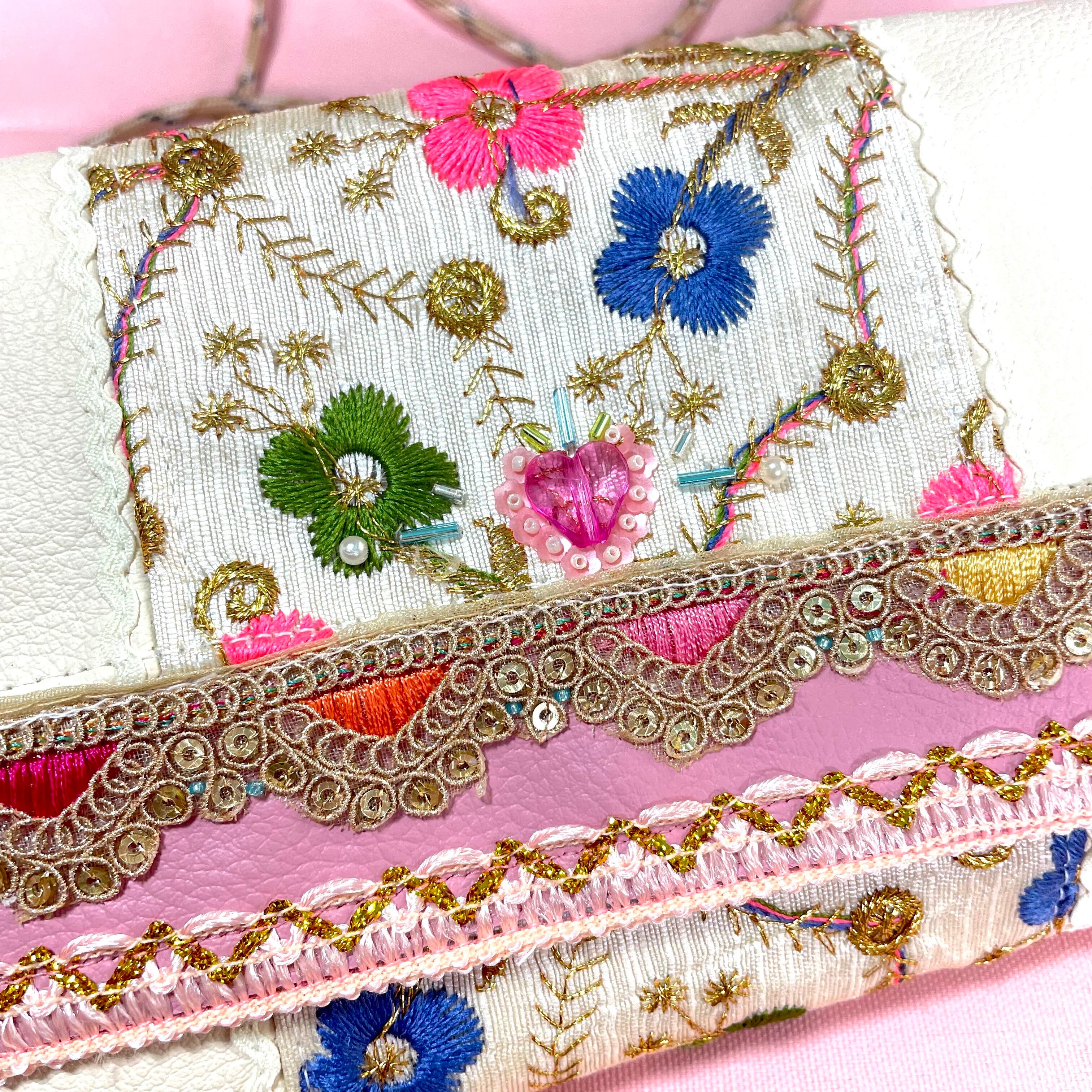 インド刺繍刺リボンもアクセントについていてかわいいです。その上部分にはハートビーズと細かいビーズを丁寧に縫いで縫い付けています。