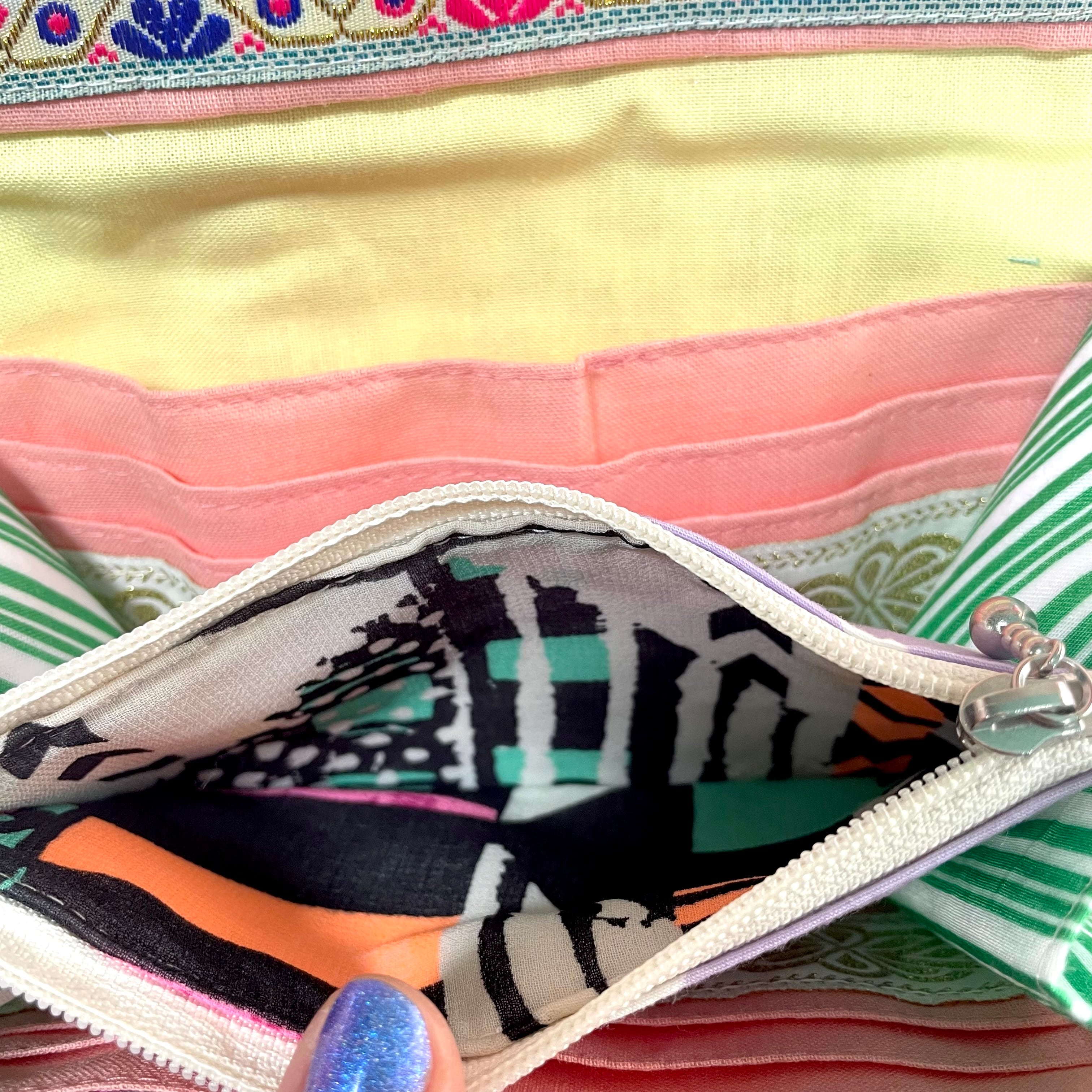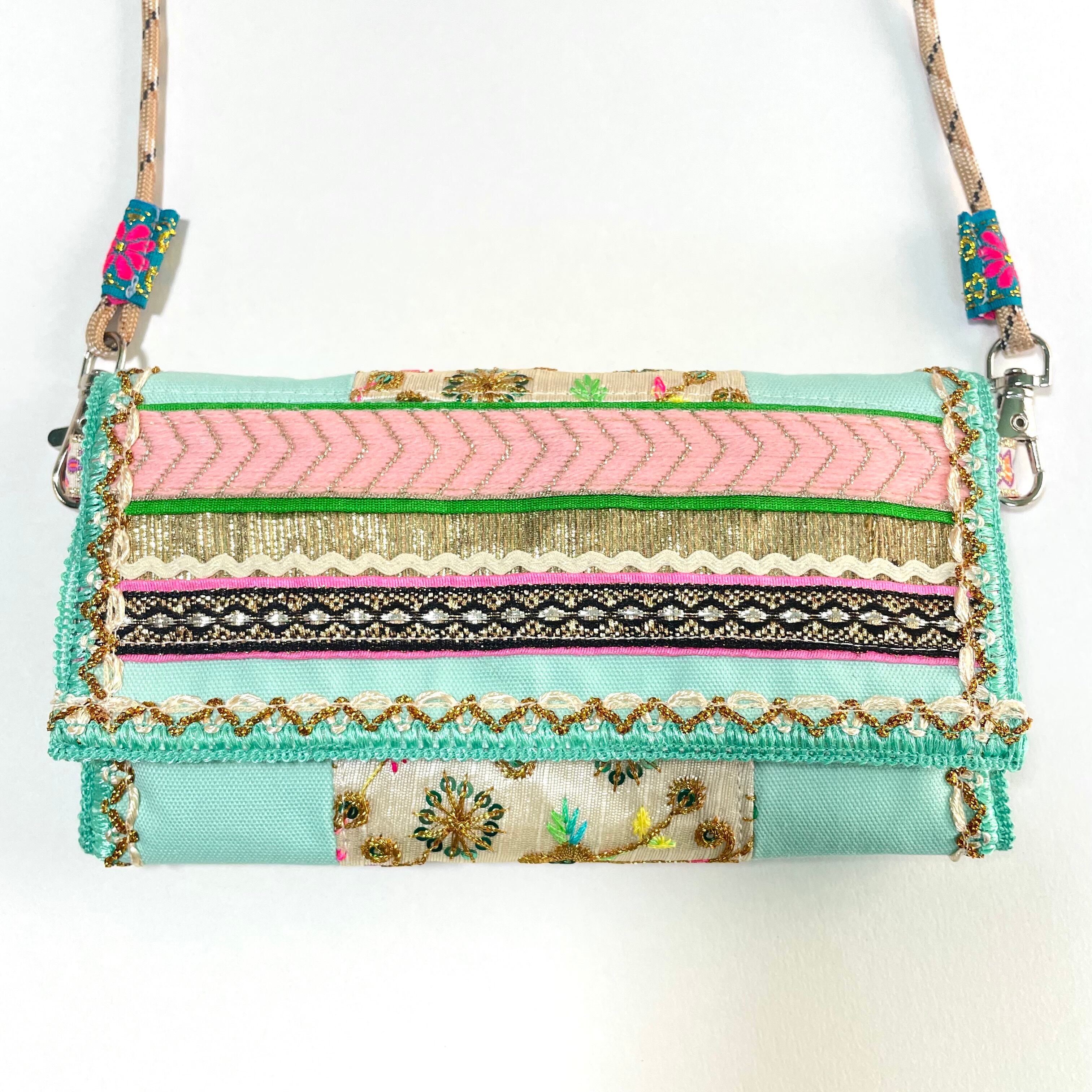 かわいいカラーのミルキーミントコットン生地にインド刺繍とインドリボンを組み合わせたミニウォレット新作完成しました。